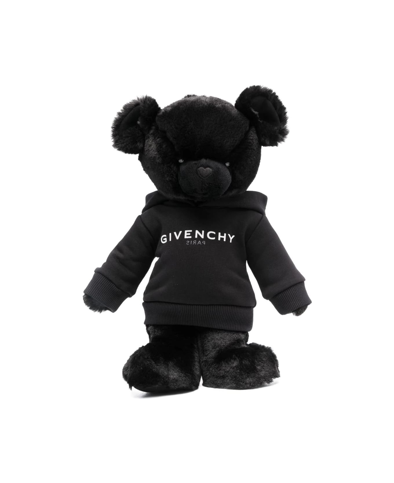 Black teddy bear signed GIVENCHY Kids embellished with a black hoodie with white GIVENCHY Paris signature on the front.