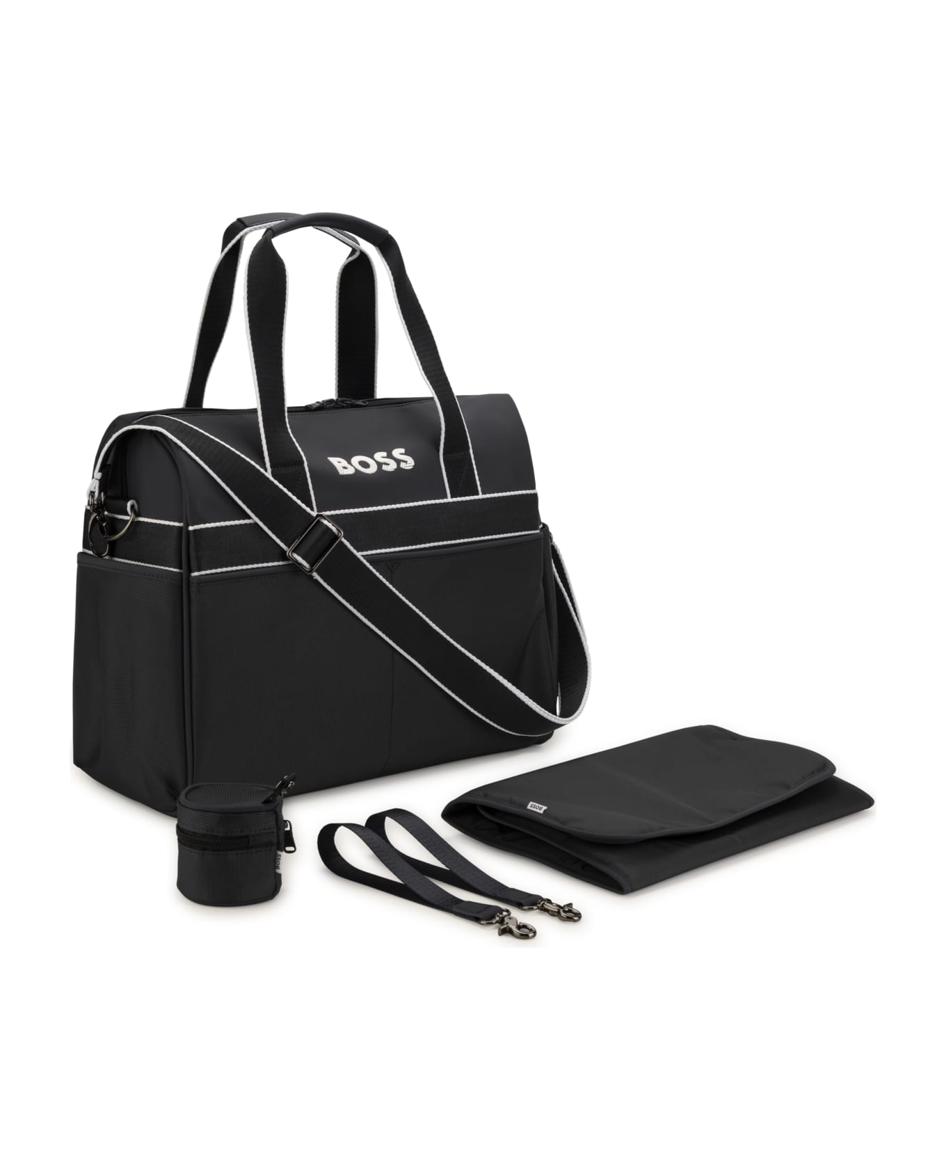 Black/white, top zip closure, logo print on the front, two handles, adjustable and removable shoulder strap and internal bellows pockets. Composition