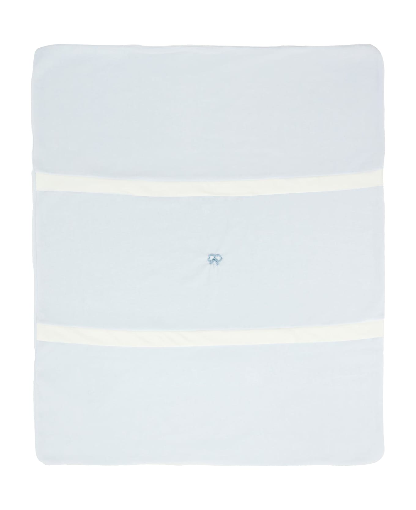 Light blue chenille blanket, with white ruffle on the front. It is embellished with an embroidered bow on the front.
