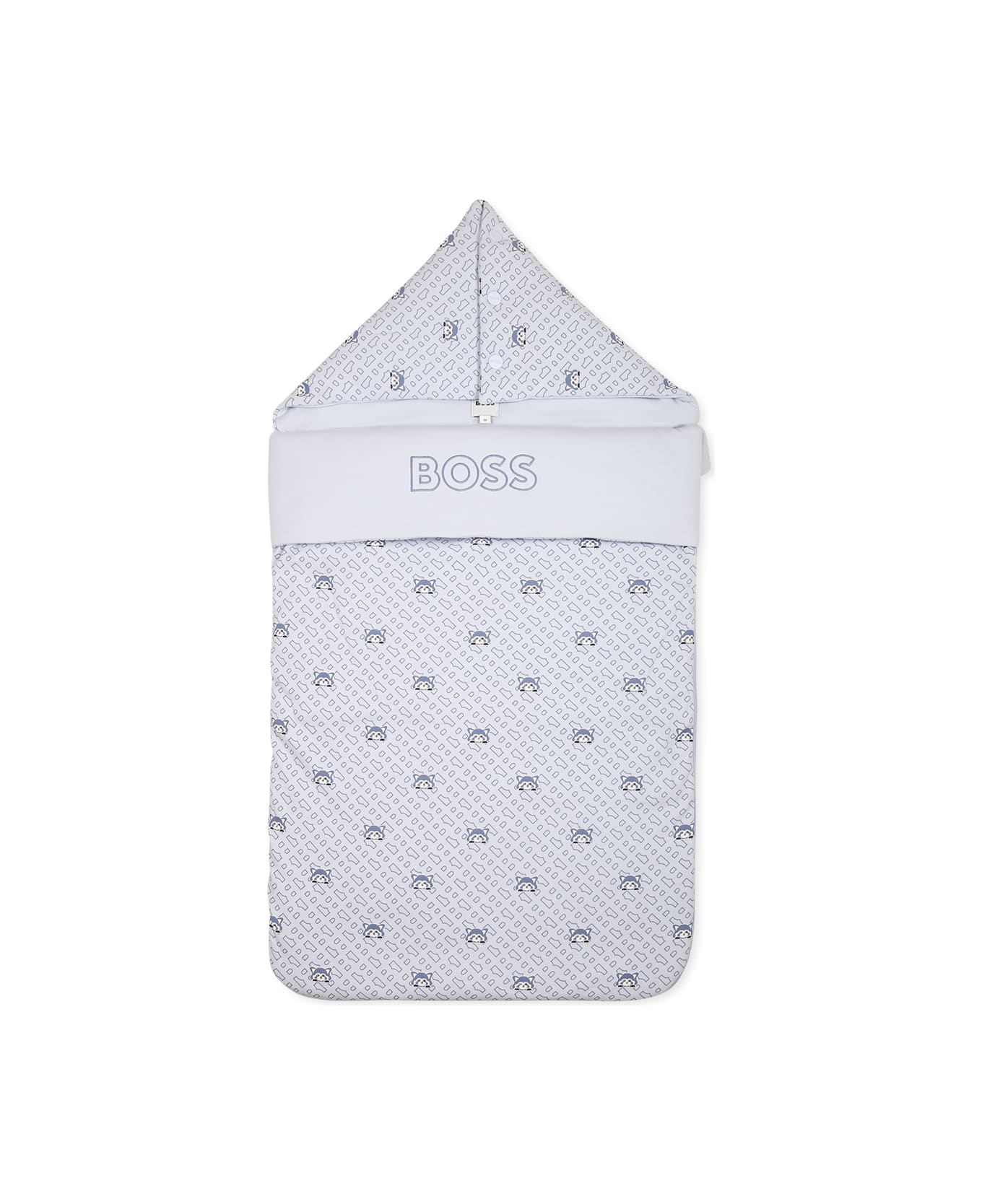 Light blue organic cotton sleeping bag, lightly padded, side zip closure and hood with snap buttons. It is embellished with an embroidered front logo, an all-over monogram and panda.