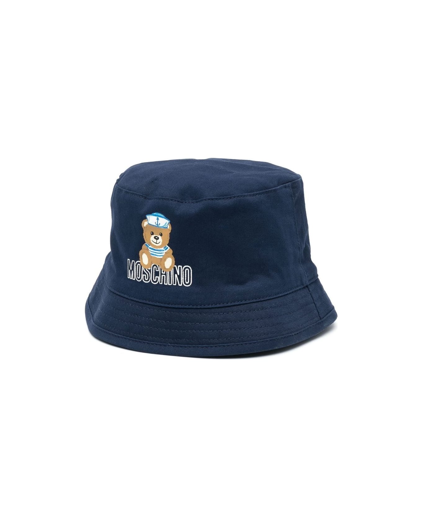 Moschino Kids bucket hat for babies in navy blue cotton poplin with sailor Moschino Teddy Bear print. Composition: Composition: 97% Cotton, 3% Elastane.