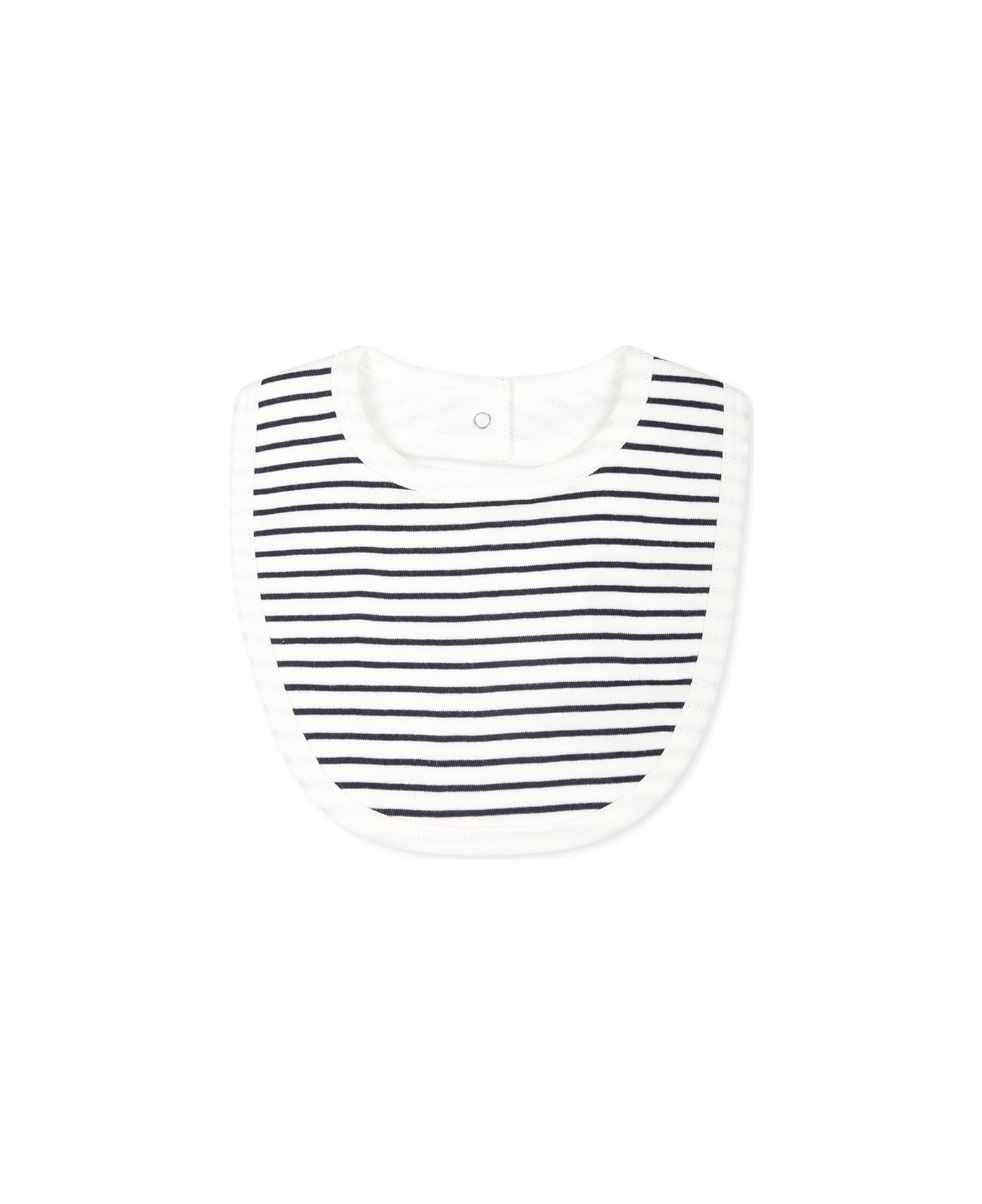 White organic cotton bib, with automatic button closure on the back, embellished with a blue striped motif.