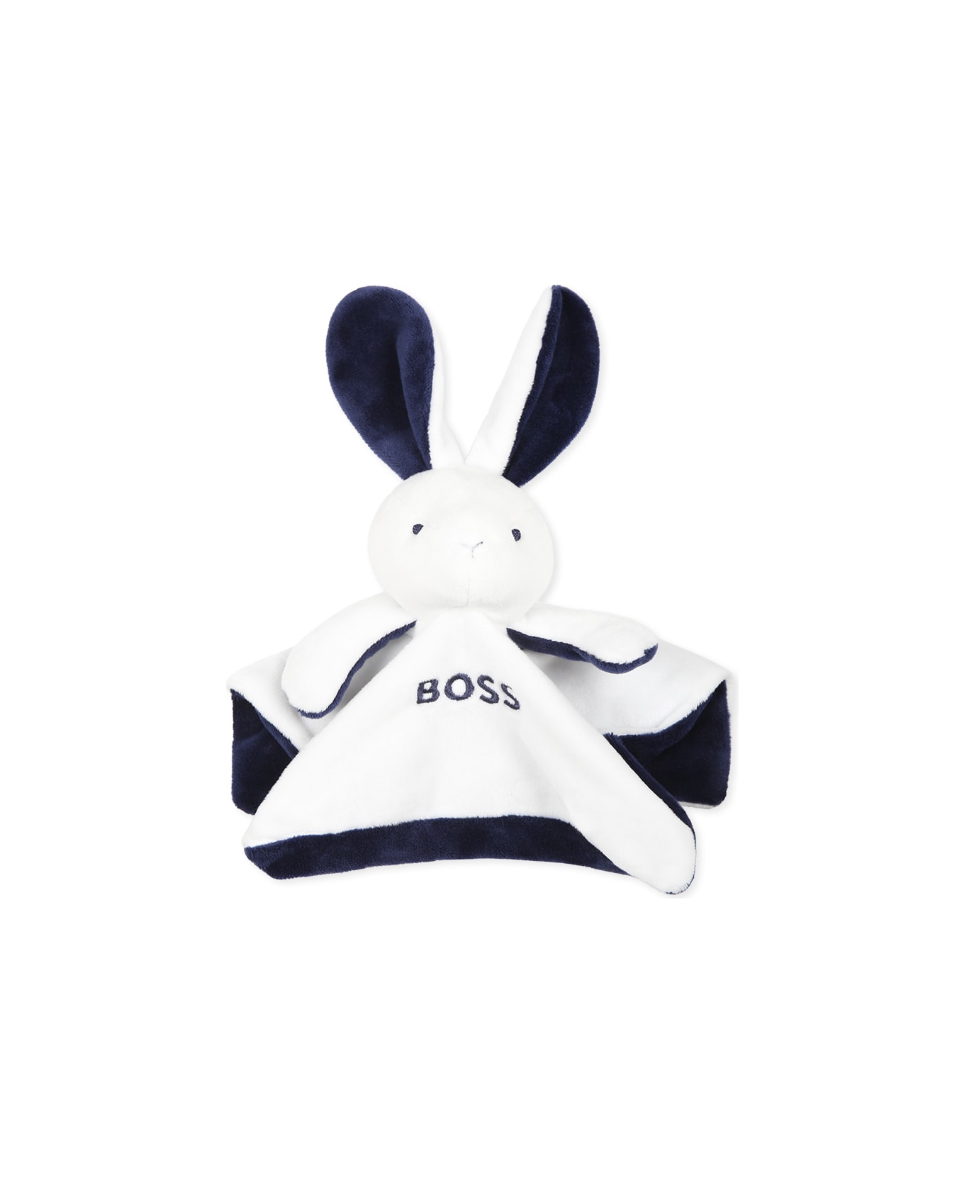Soft and fluffy white doudou, rabbit-shaped, with logo embroidered on the front.