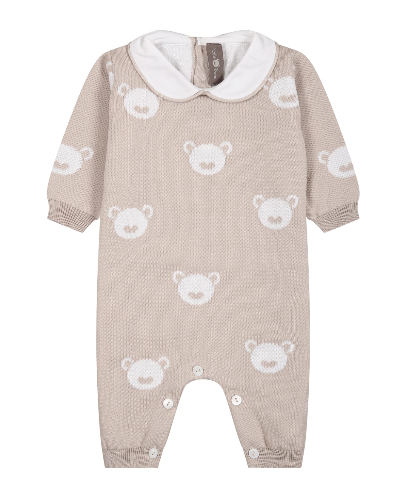 Beige cotton onesie, with long sleeves, white peter pan collar, button closure on the back and between the legs. It is embellished with all-over polar bears.