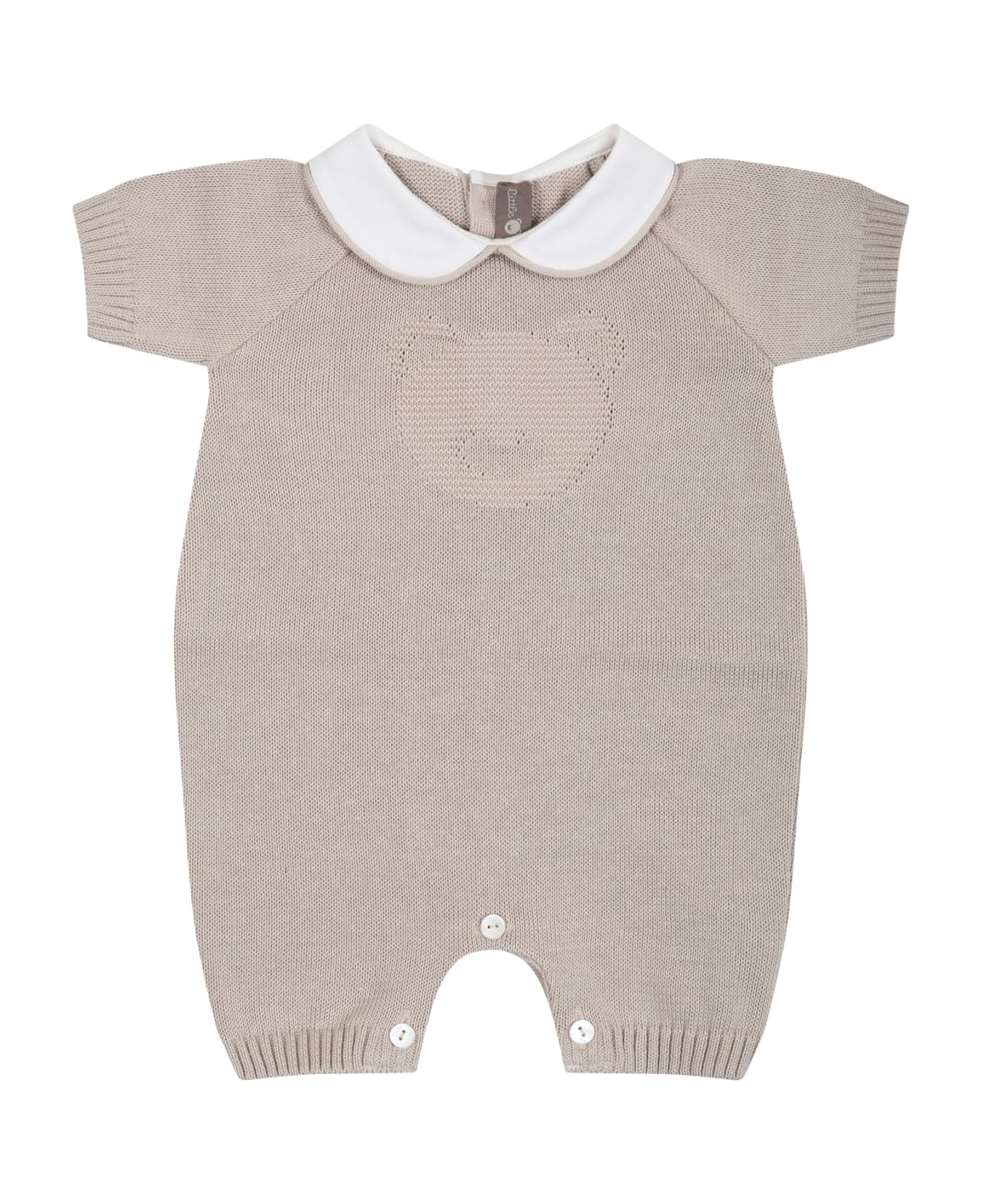 Beige romper, in cotton, with short sleeves, peter pan collar, button closure on the back and between the legs. It is embellished with embroidered bear on the front.