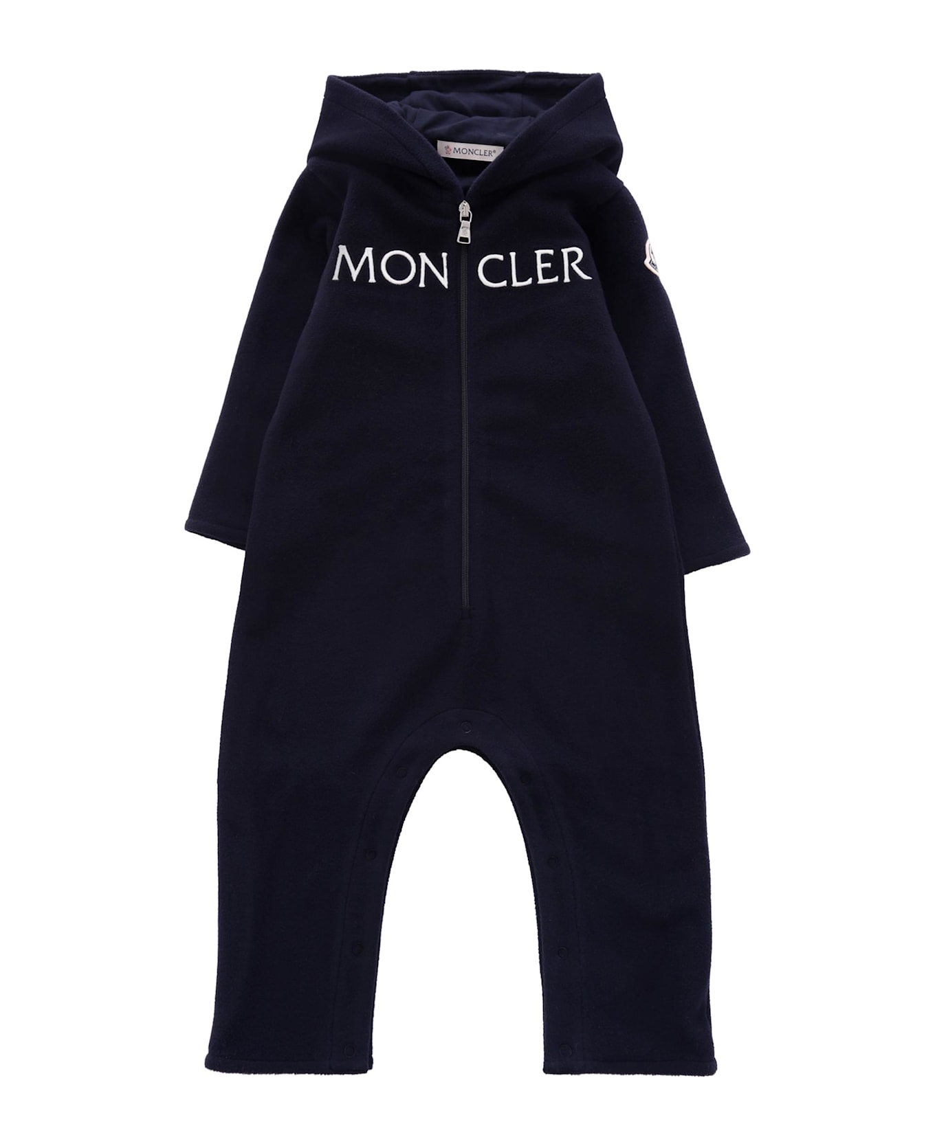 Blue fleece babygrow from the luxury brand Moncler Kids, with hood, long sleeves, front zip fastening and snap buttons between the legs. It is embellished with an embroidered logo on the front and an iconic logo patch applied on the sleeve.