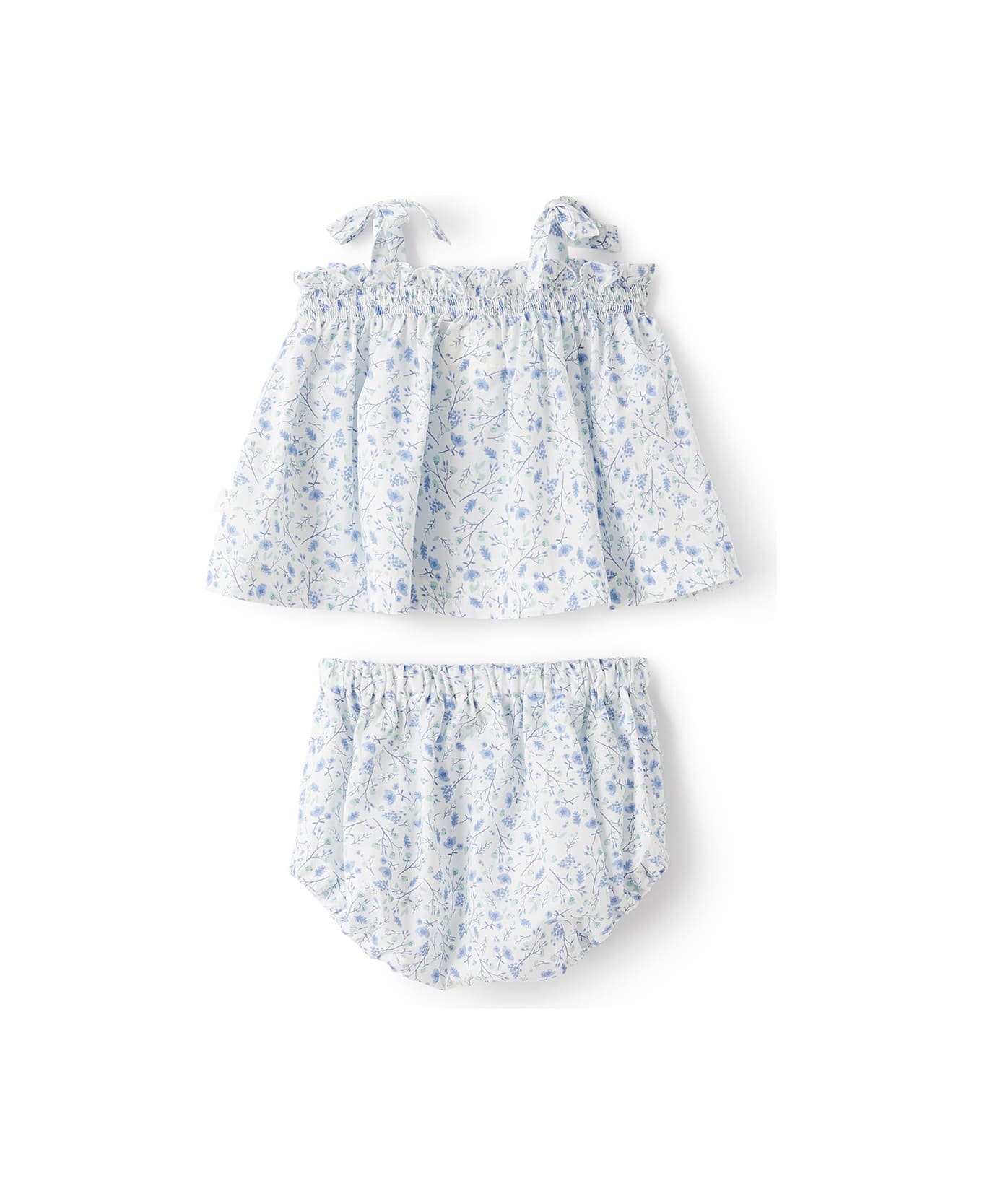 Teddy & Minou three-piece set made of 100% white organic cotton with a floral pattern in shades of blue and green. Suit consisting of a flared cut dress with ruffled yoke and bow-knotted braces, combined with a culotte with a practical elasticated waist and leg bottom and elasticated band with bow detail.