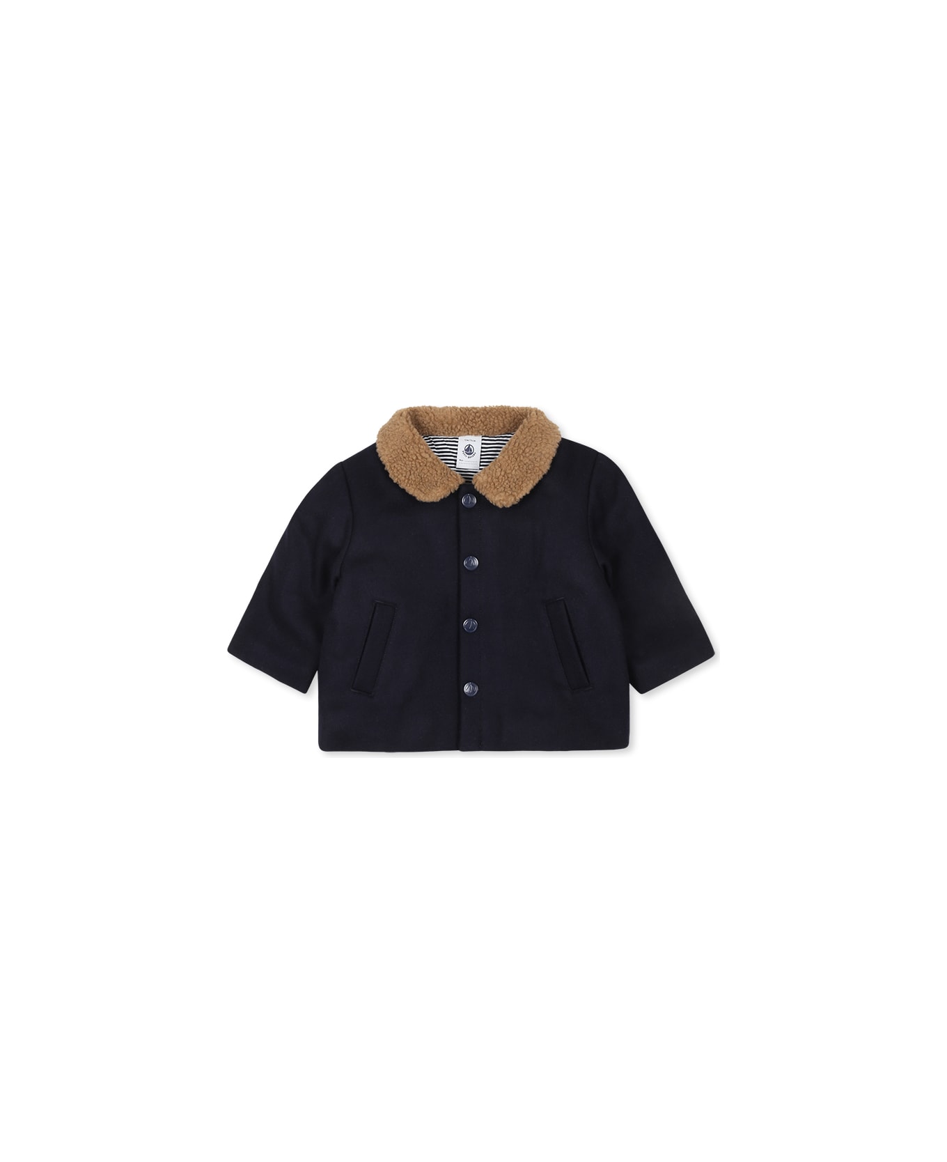 Blue wool canvas jacket, long sleeves, with collar and sherpa lining, front closure with snap buttons and side pockets. It is embellished with a logo patch on the sleeve. This garment is made with premium wool and respectful of animal welfare.