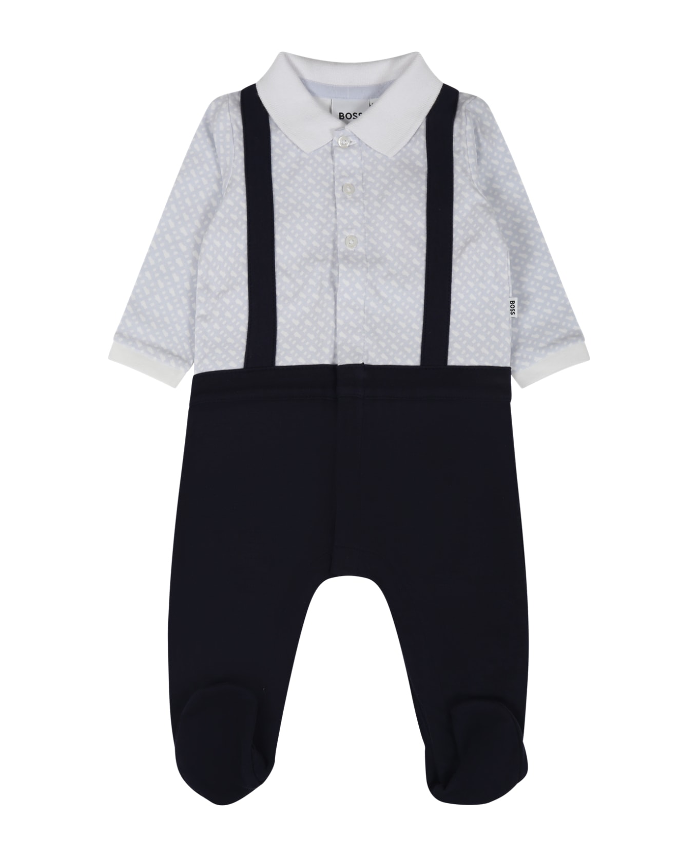 Blue onesie, with long sleeves, collar, feet, popper fastening, front and between the legs. It is embellished with blue all-over Boss monogram, on the top.