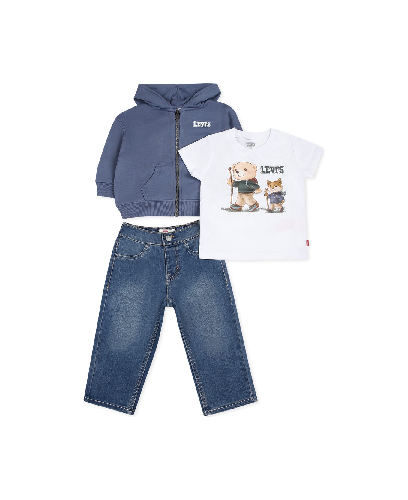Blue suit composed of sweatshirt, t-shirt and jeans. Blue sweatshirt in fleece cotton, with long sleeves, hood, front zip fastening, pockets on the front, ribbed cuffs and hem. It is embellished with a logo on the chest. White t-shirt with short sleeves and ribbed crew neck. It is embellished with a bear print and logo on the front. Jeans with elastic on the back, front hook fastening and side pockets. They are embellished with a logo patch on the back.