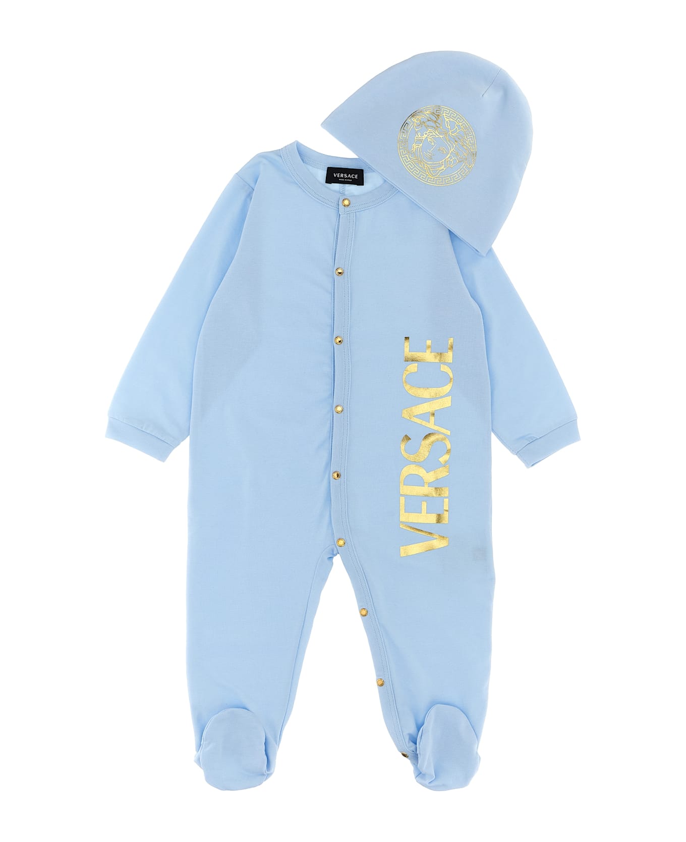 Cotton baby set with prints consisting of hat and bodysuit with front snap button closure, crew neck, long sleeves with cuffs, leg with foot. Composition: 94% cotton 6% elastane