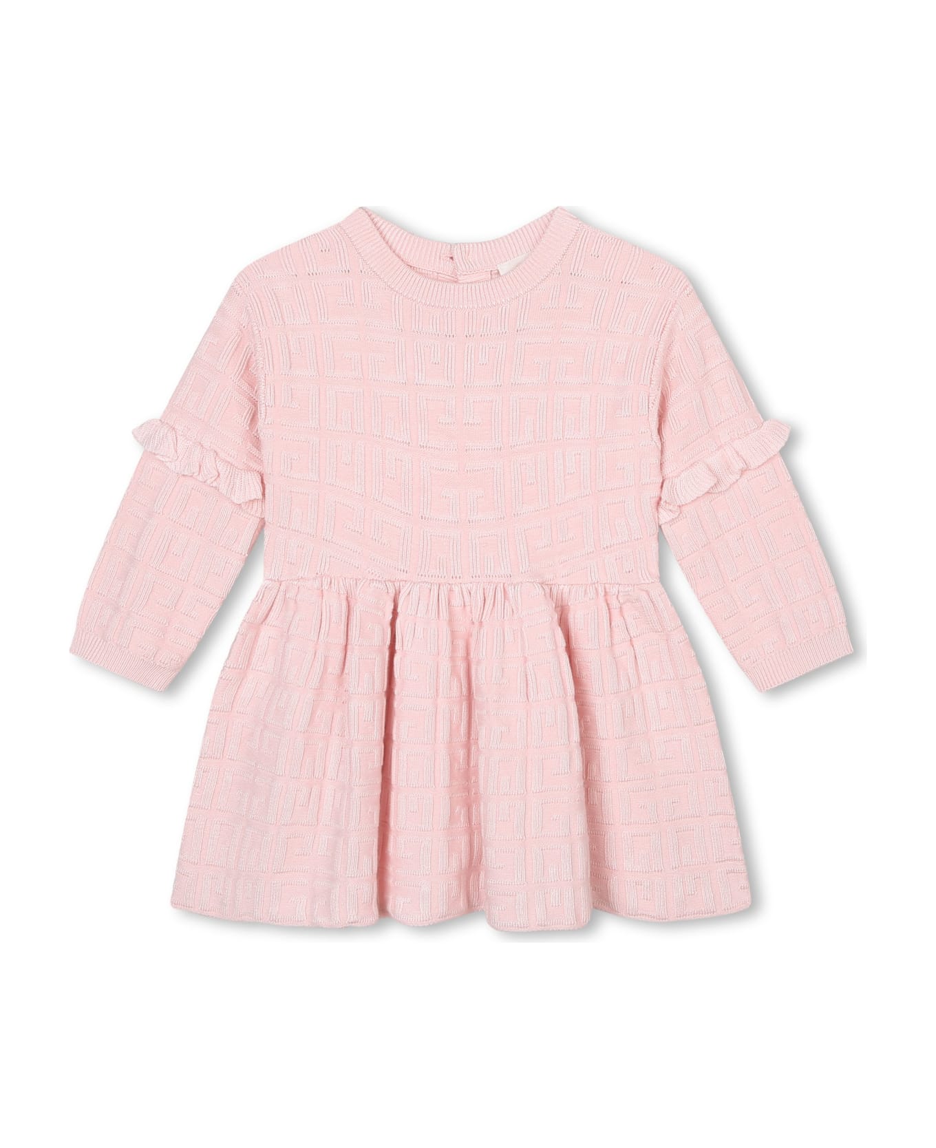 monogram knitted dress from Givenchy Kids featuring rose pink, knitted construction, patterned jacquard, pleat detailing, flared, ruffled trim, round neck, long sleeves, rear button fastening and straight hem.