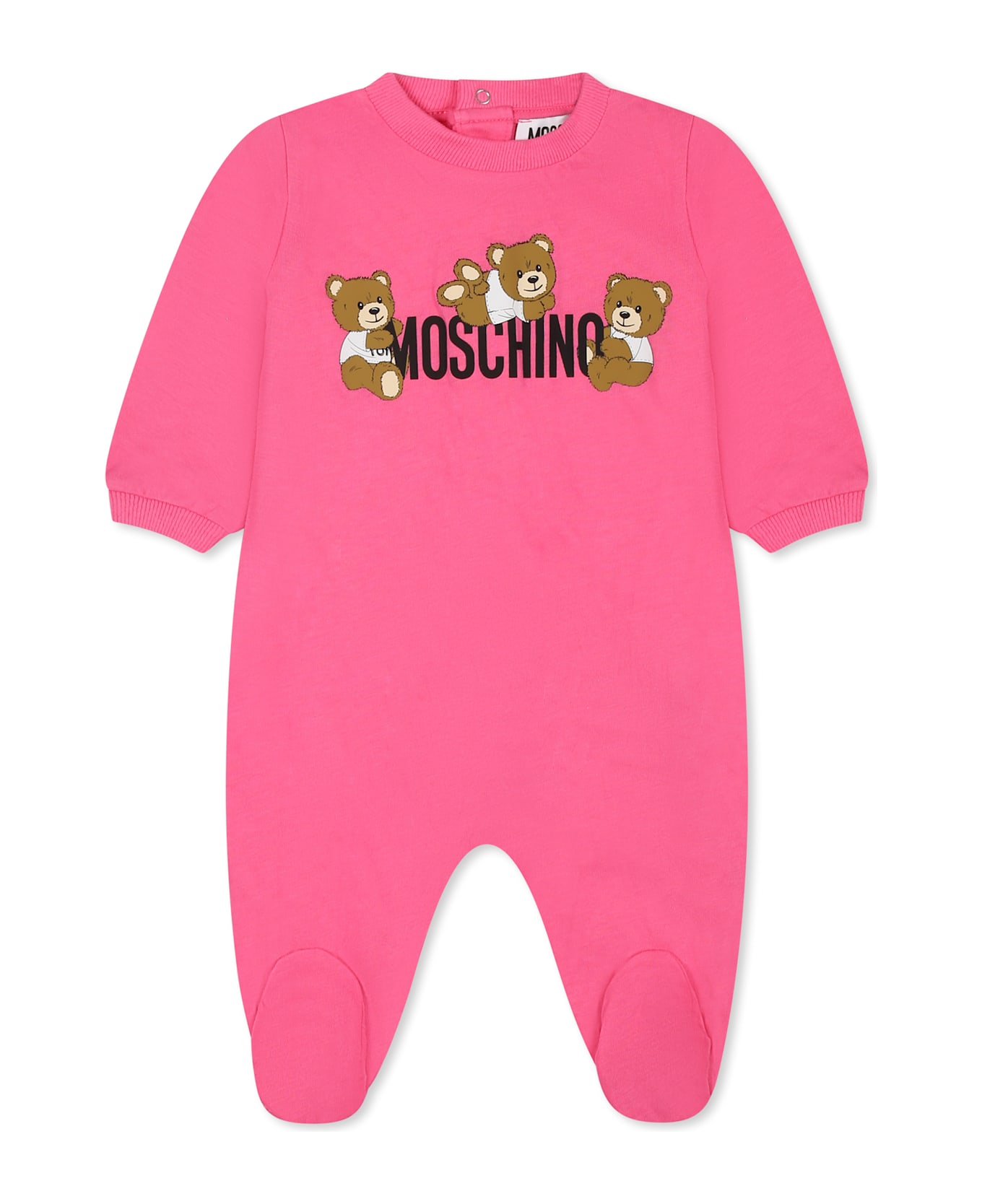 Fuchsia babygrow from the Moschino Kids brand, in cotton, with long sleeves, ribbed crew neck and cuffs, feet and snap buttons on the back. It is embellished with three Teddy Bears and logo on the front.