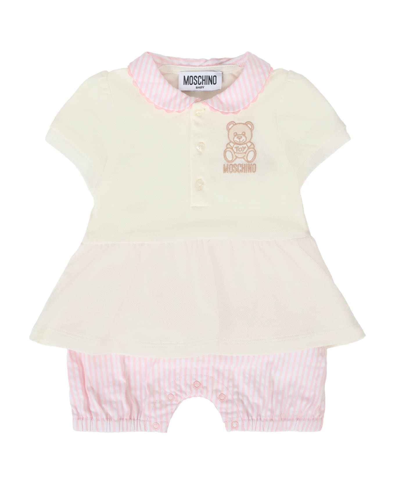 Ivory romper from the Moschino Kids brand, in a cotton blend, with short sleeves, a striped pink Peter Pan collar, a cotton pique bodice, a button fastening on the front, snap buttons between the legs, a flounce at the waist, a striped bottom and an elasticated hem. It is embellished with a Teddy Bear and logo, embroidered on the chest.