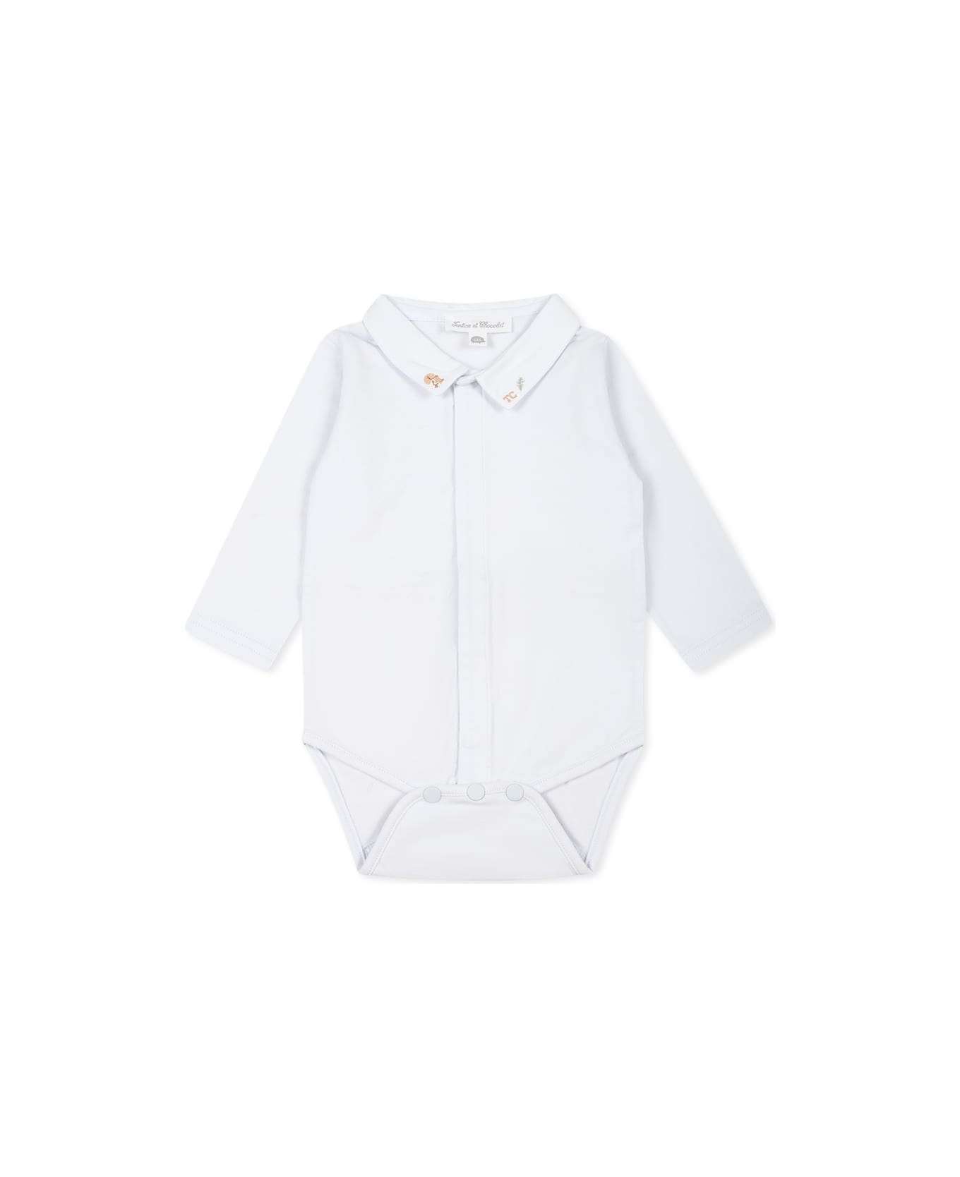 Light blue body with long sleeves, pointed collar, automatic button closure on the front and between the legs. It is embellished with logo and embroidery on the collar