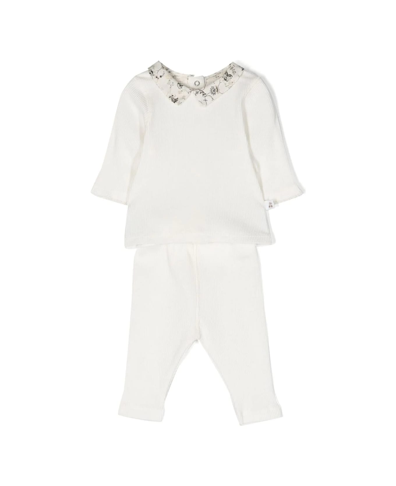 Milk-white Denise set by Bonpoint consisting of a long-sleeved top, a pair of ribbed trousers and a stuffed bunny. Floral fabric details. Snap button fastening at the back. All pieces are made of certified organic cotton.