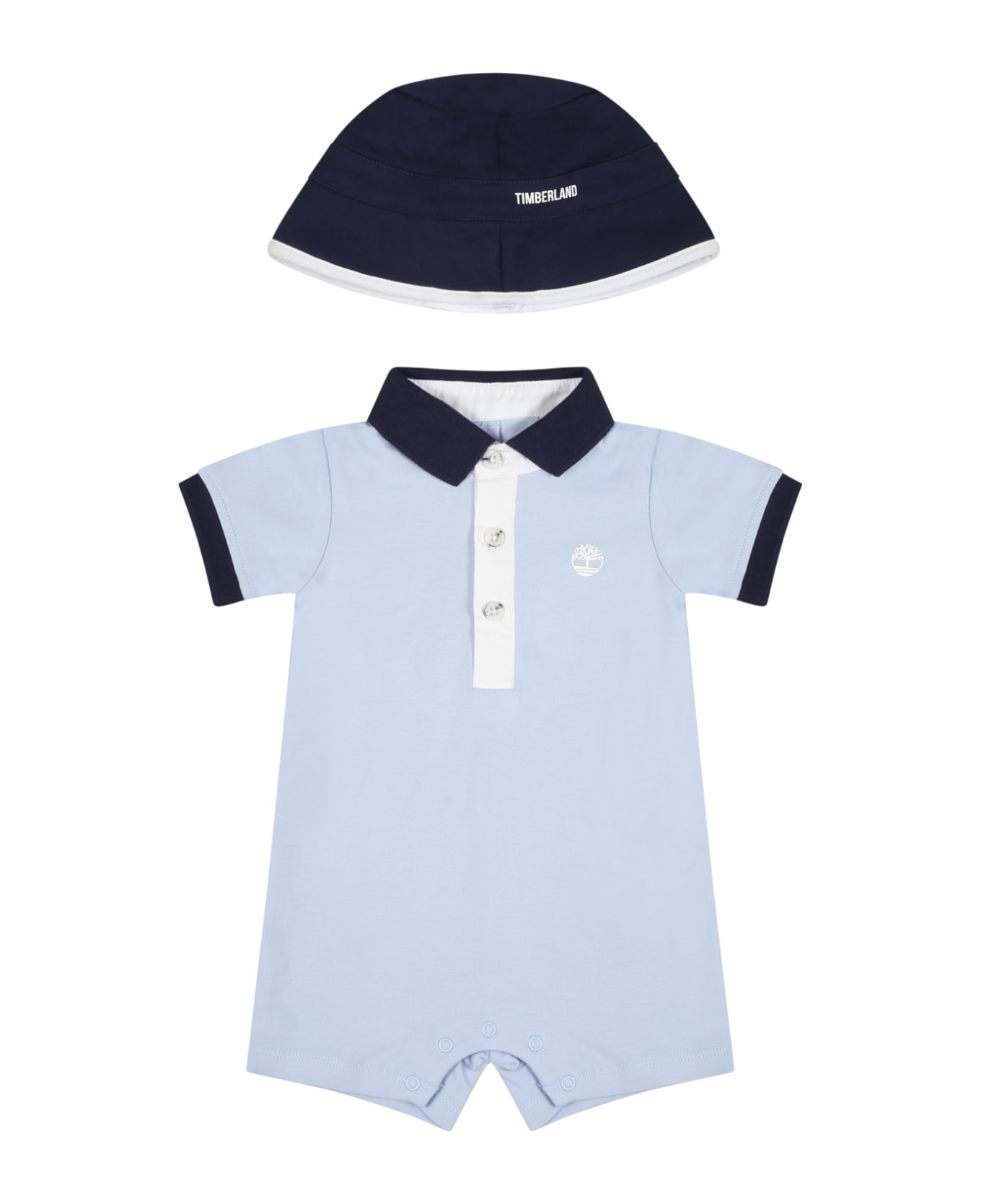 Multicolor set composed of romper and cloche. Light blue romper in cotton, with short sleeves, classic collar with button closure and snap closure between the legs; it is embellished with white logo on the chest. Blue cloche in cotton with white hem, embellished with white logo on the front.
