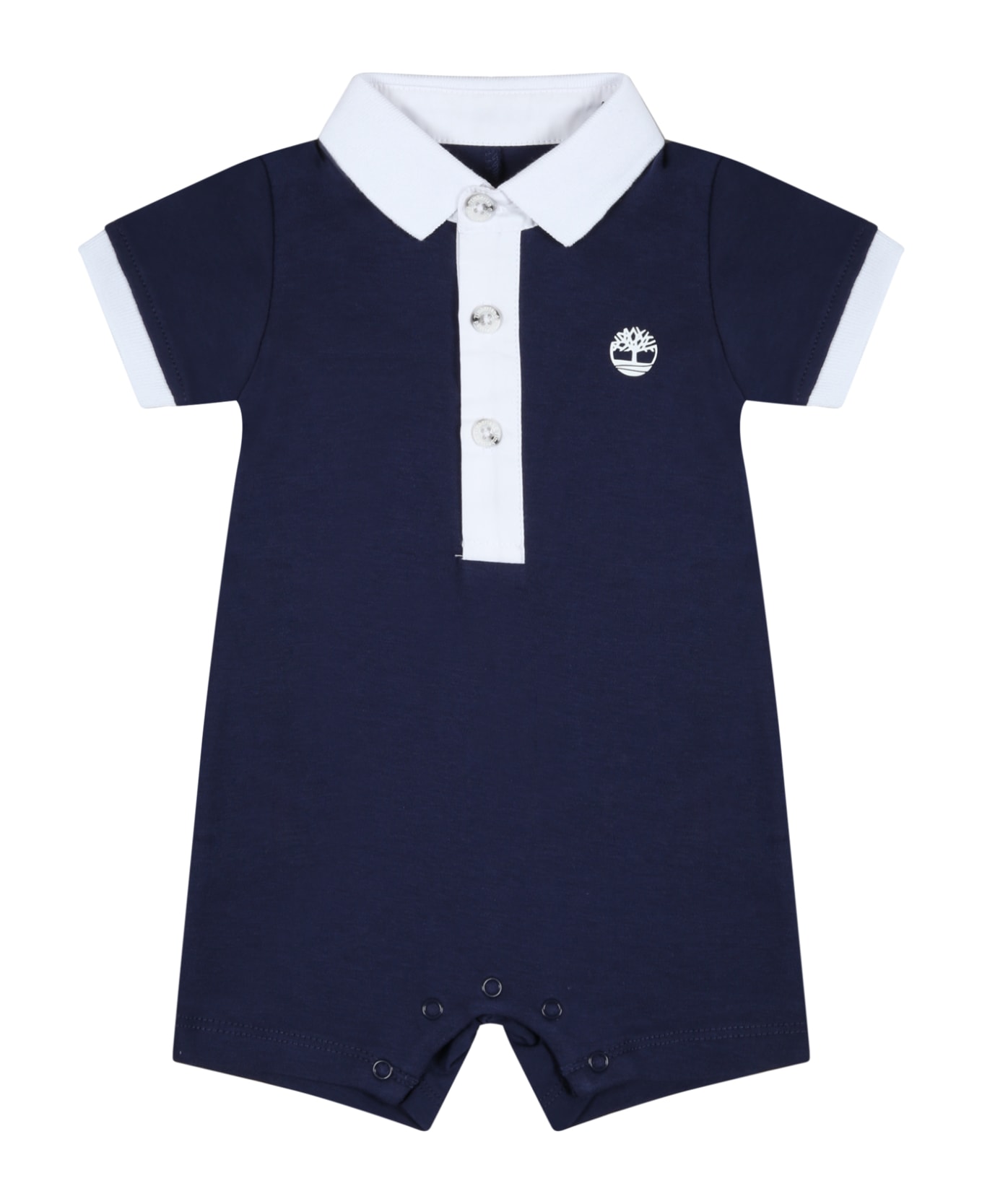 Multicolor set composed of romper and cloche. Blue romper in cotton, with short sleeves, classic collar with button closure and snap closure between the legs; it is embellished with white logo on the chest. Blue cloche in cotton with white hem, embellished with white logo on the front.