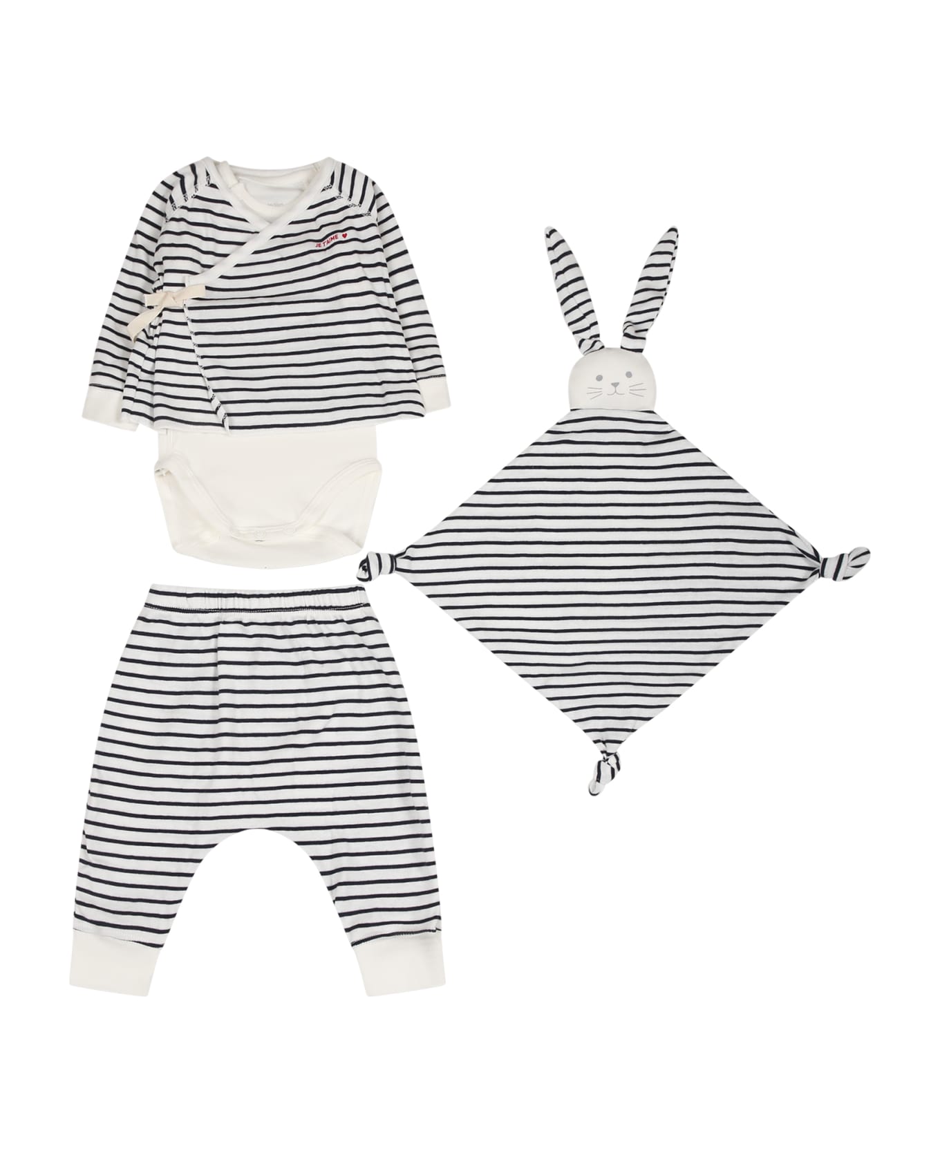 Multicolor suit in Oeko-Tex certified cotton composed of Doudou, body, t-shirt and trousers. Multicolor doudou in cotton. It is embellished with padded rabbit and blue and white lines. White body in cotton, long sleeves, ribbed cre-neck, hem and cuffs, closure with snap buttons between the legs. Multicolor t-shirt in cotton, long sleeves with white cuffs, crew-neck, ribbed crew-neck, hem and cuffs. It is embellished with blue and white lines. Multicolor trousers in cotton, elastic waistband. It is embellished with blue and white lines.