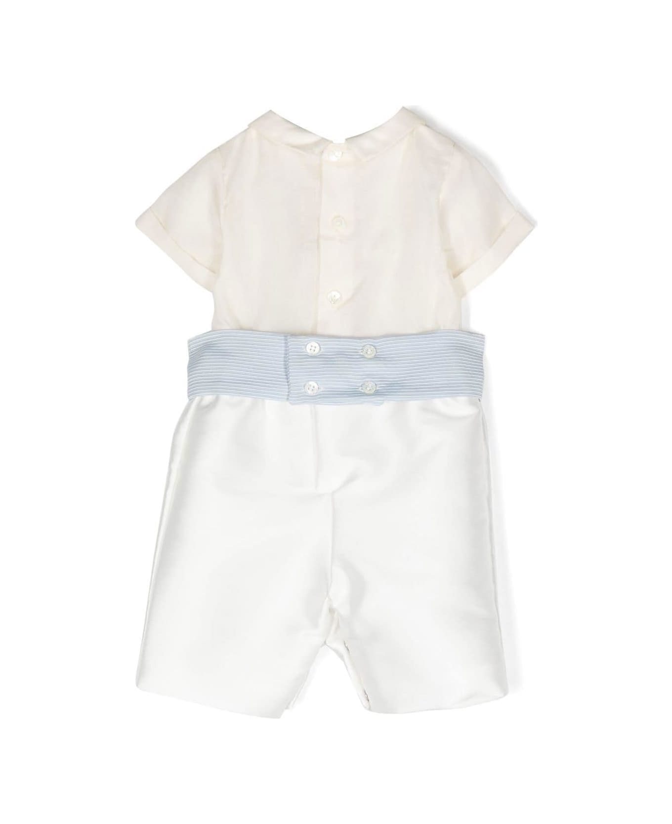 White onesie, with bow tie and light blue stitched waistband. Lining: Cotton 100% Outer: Polyester 85%, Silk 15%