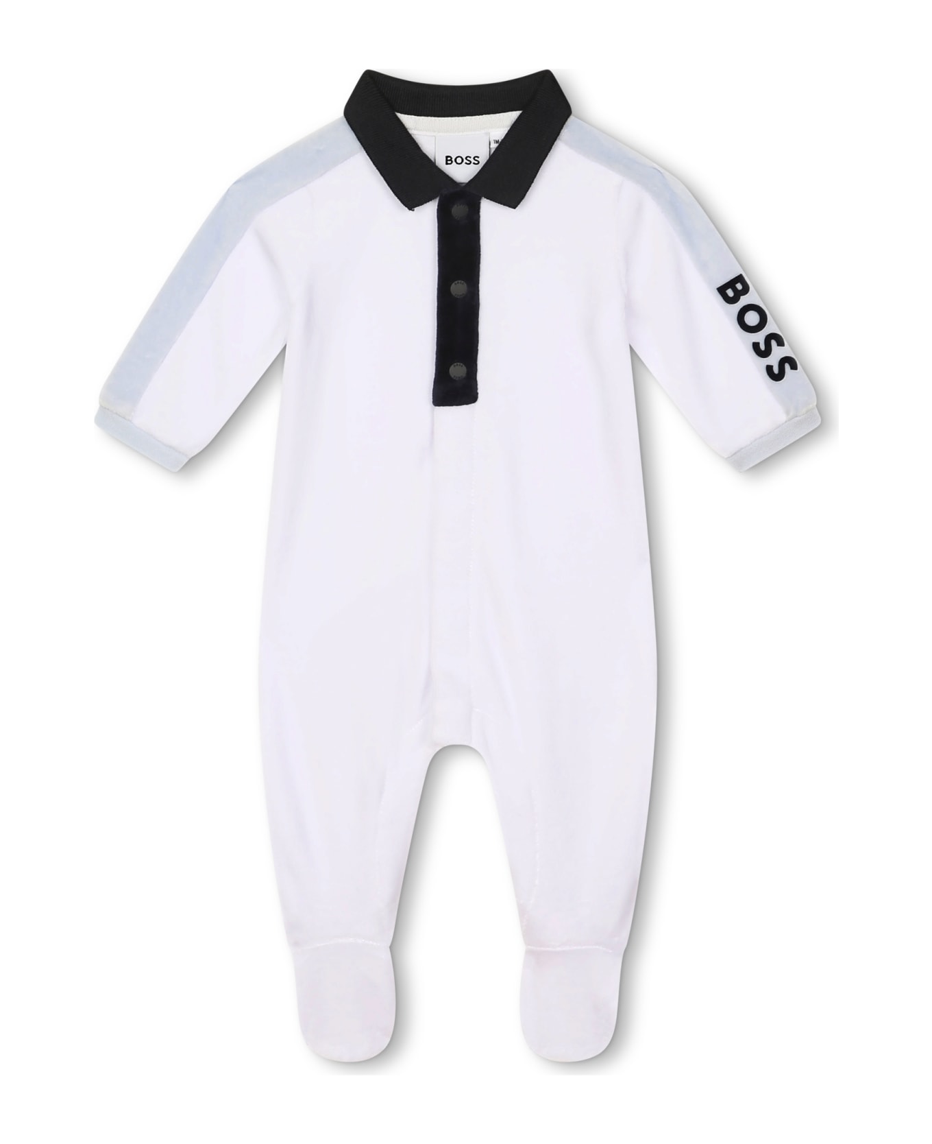 logo-print long-sleeve pajamas from BOSS Kidswear featuring white/black, cotton blend, logo print at the sleeve, polo collar, long sleeves, booties and press-stud fastening.
