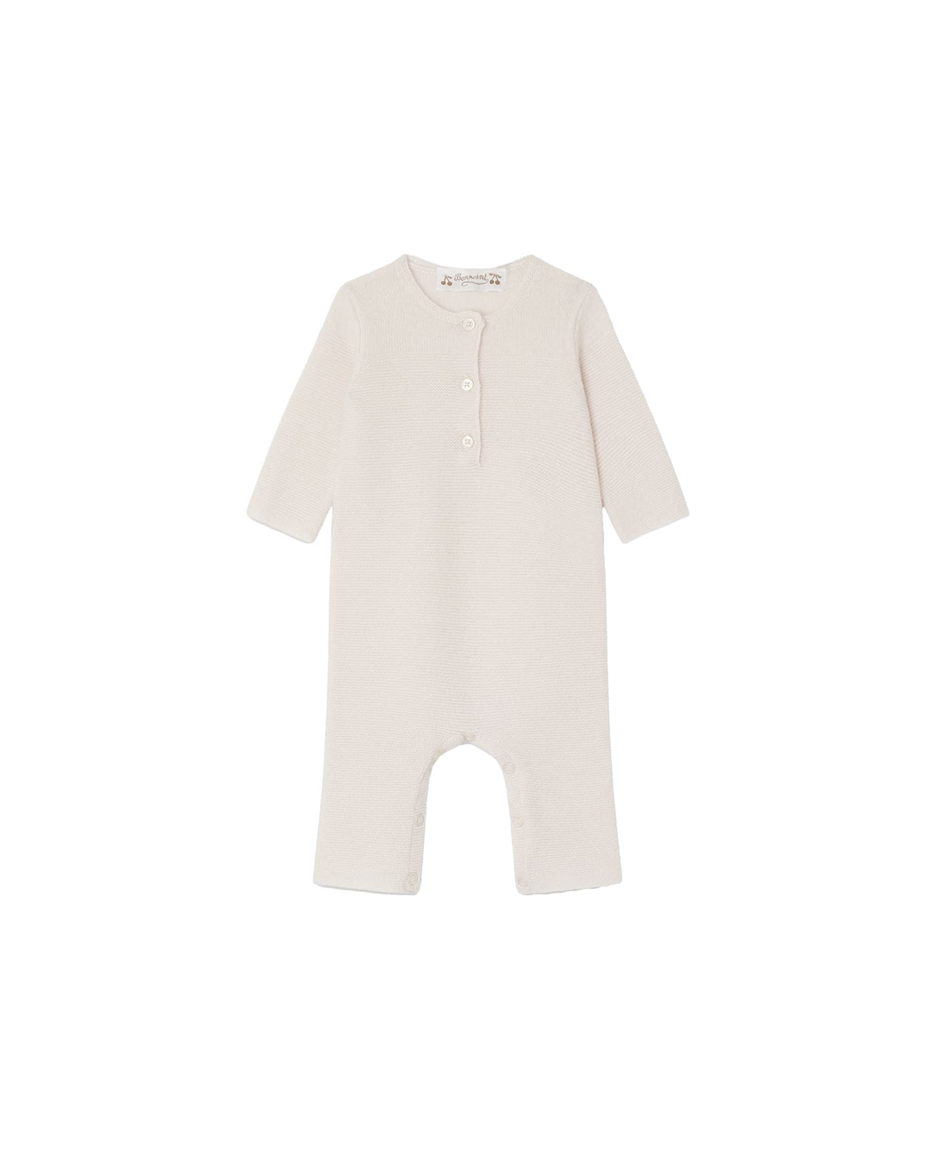 Pale pink Babylou playsuit by Bonpoint made of certified pure cashmere shaved knit that guarantees animal welfare. This model features a round neckline, long sleeves, a breast pocket and a snap button opening at the crotch.