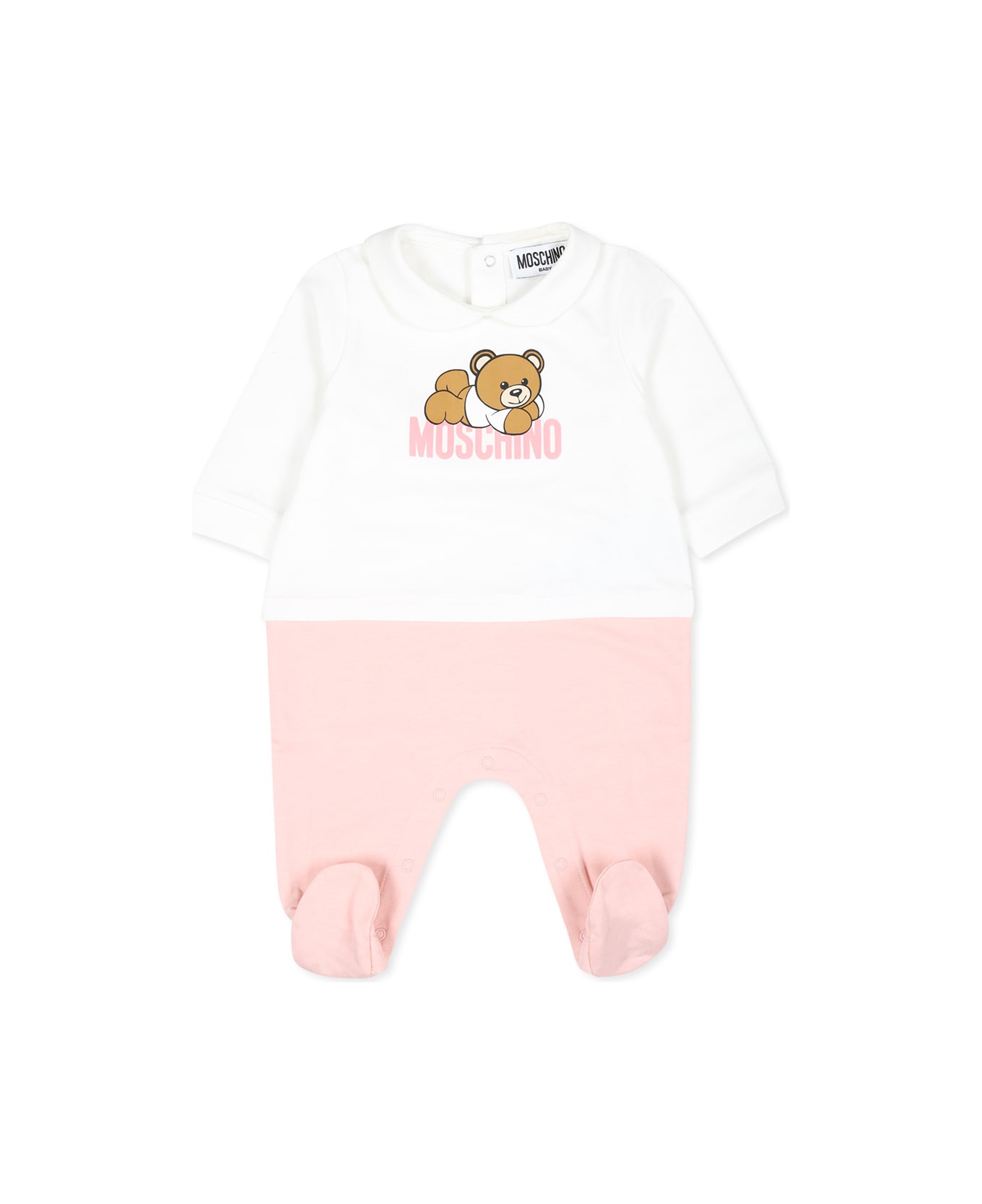 Beige babygrow from the Moschino Kids brand, made of soft organic cotton jersey. The long sleeve babygrow features a peter pan collar, presser feet, popper fastening at the back and between the legs. It is embellished with lying Teddy Bear and logo on the front.