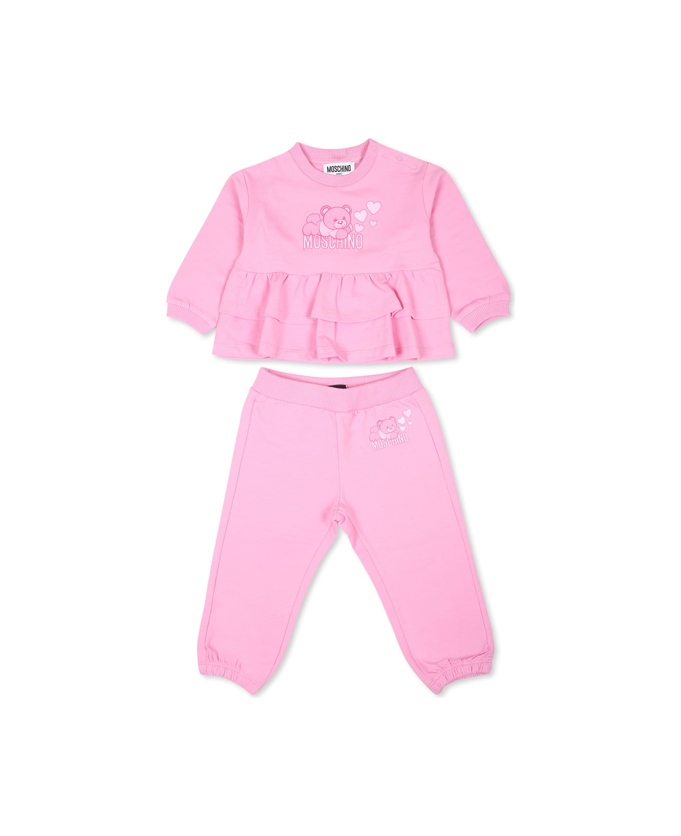 Pink suit from the Moschino Kids brand, in fleece cotton, composed of sweatshirt and trousers. Long sleeve sweatshirt, with ribbed crew neck, snap button closure on the shoulder, ruffles on the hem and ribbed cuffs. Trousers with elasticated waist and elasticated ankles. It is embellished with lying Teddy Bear, hearts and logo.