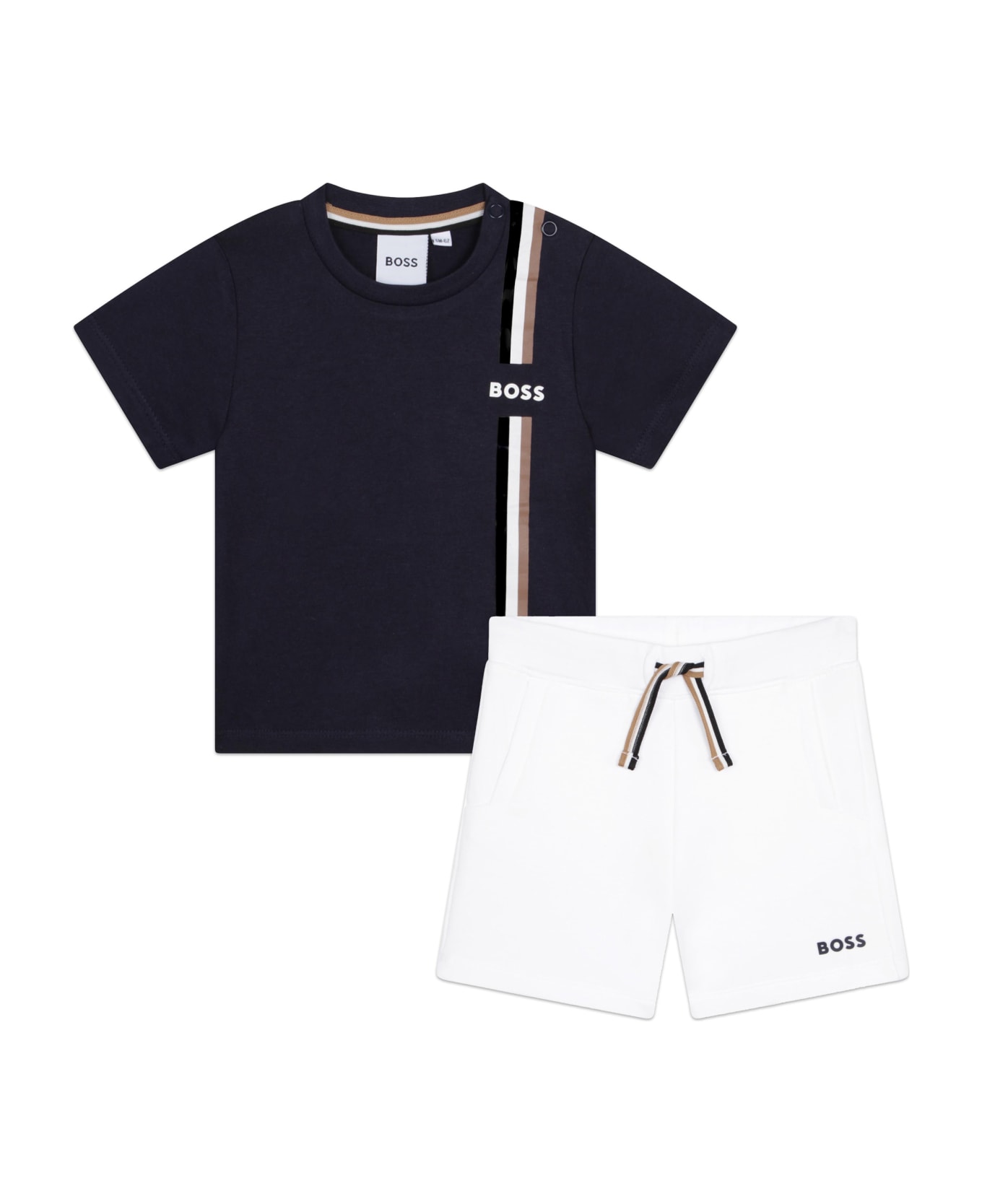 Navy blue, cotton, side stripe detail, logo print to chest, drawstring waist, round neckline and short sleeves. Composition 100% Cotton