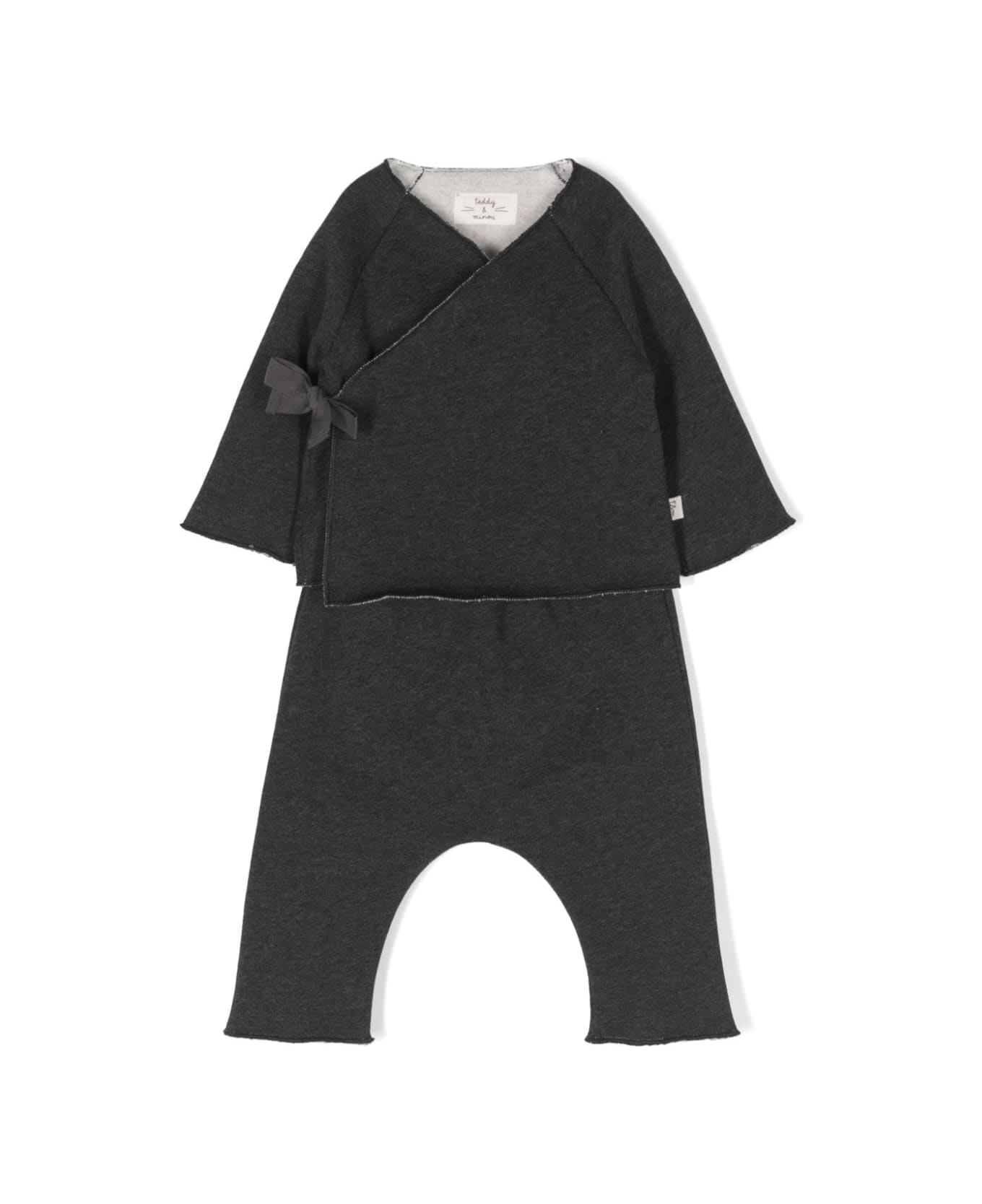 Teddy&Minou two-piece set made of anthracite-coloured organic cotton fleece and consisting of a kimono-style top with side bow and trousers with elasticated waist. Profiles finished with matching overlock seams. The dyes used to dye the garment are non-toxic and biodegradable.