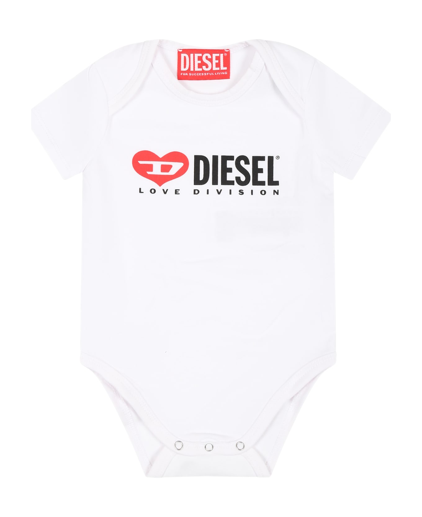 White body in cotton, short sleeves, crew-neck, closure with automatic buttons between the legs, ribbed crew-neck and cuffs. It is embellished with black printed logo.