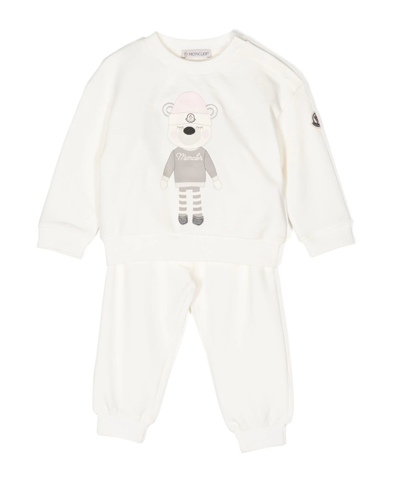 white cotton set teddy bear print, and logo print to the front logo patch at the sleeve crew neck press-stud fastening at the shoulder long sleeves ribbed cuffs and hem straight hem
