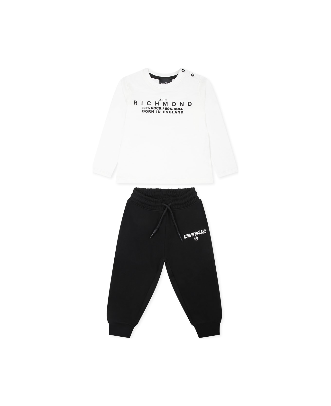 White cotton suit, conmposed of a t-shirt and trousers. Long-sleeved t-shirt, with a ribbed crew neck and snap button fastening on the front. It is decorated with a printed logo on the front and back. Black trousers in slightly fleeced cotton, with an elasticated waist, drawstring and ribbed ankles. They are embellished with a logo on the front.