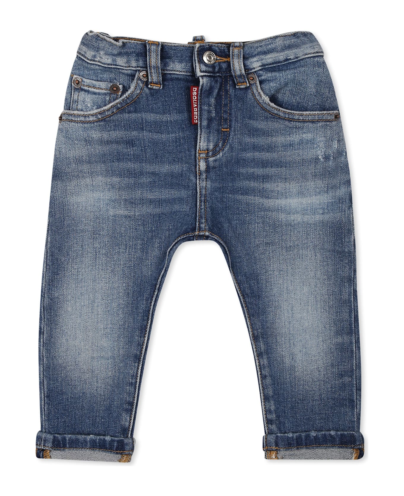 Five-pocket denim jeans with belt loops, front zip and button fastening, adjustable waist with internal elastic with buttons, worn-effect details and cuffed ankles. They are embellished with a logo patch on the front and back.