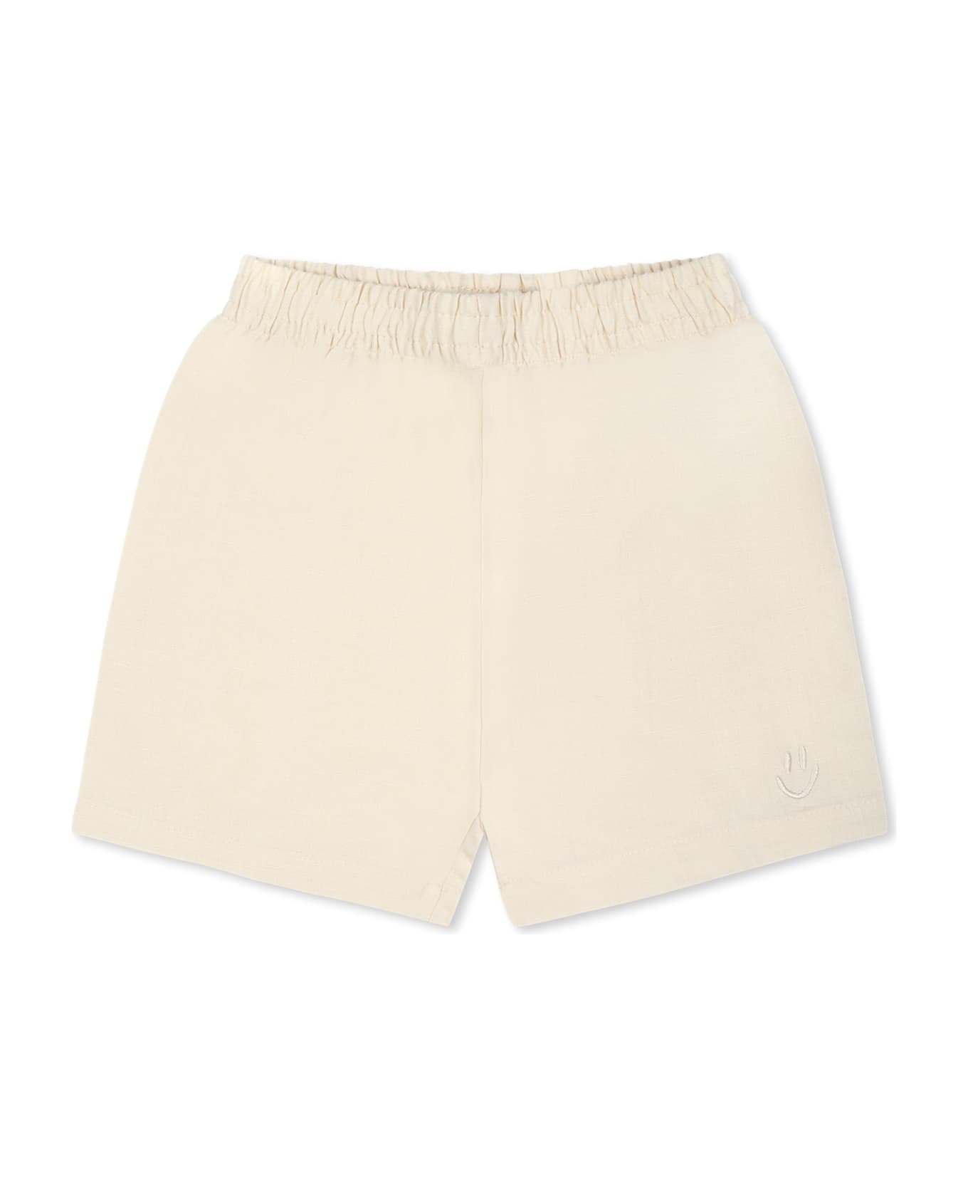Ivory shorts in a linen and cotton blend, with an elasticated waist. They are embellished with an embroidered smile on one leg.