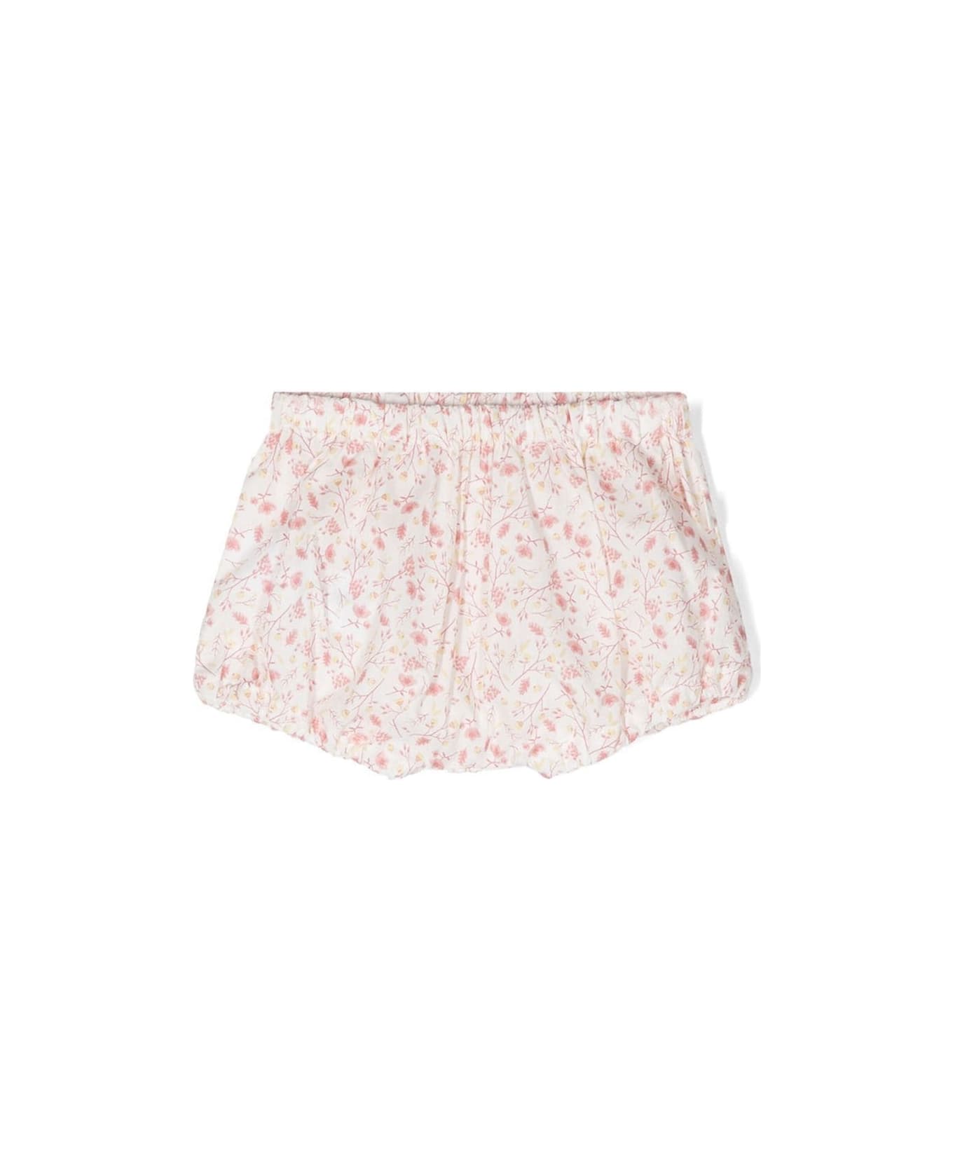 Teddy & Minou culotte made of 100% white organic cotton with a flower print in shades of pink and yellow. Model with elastic at waist and bottom leg. Teddy & Minou logo label applied on the left side of the garment.