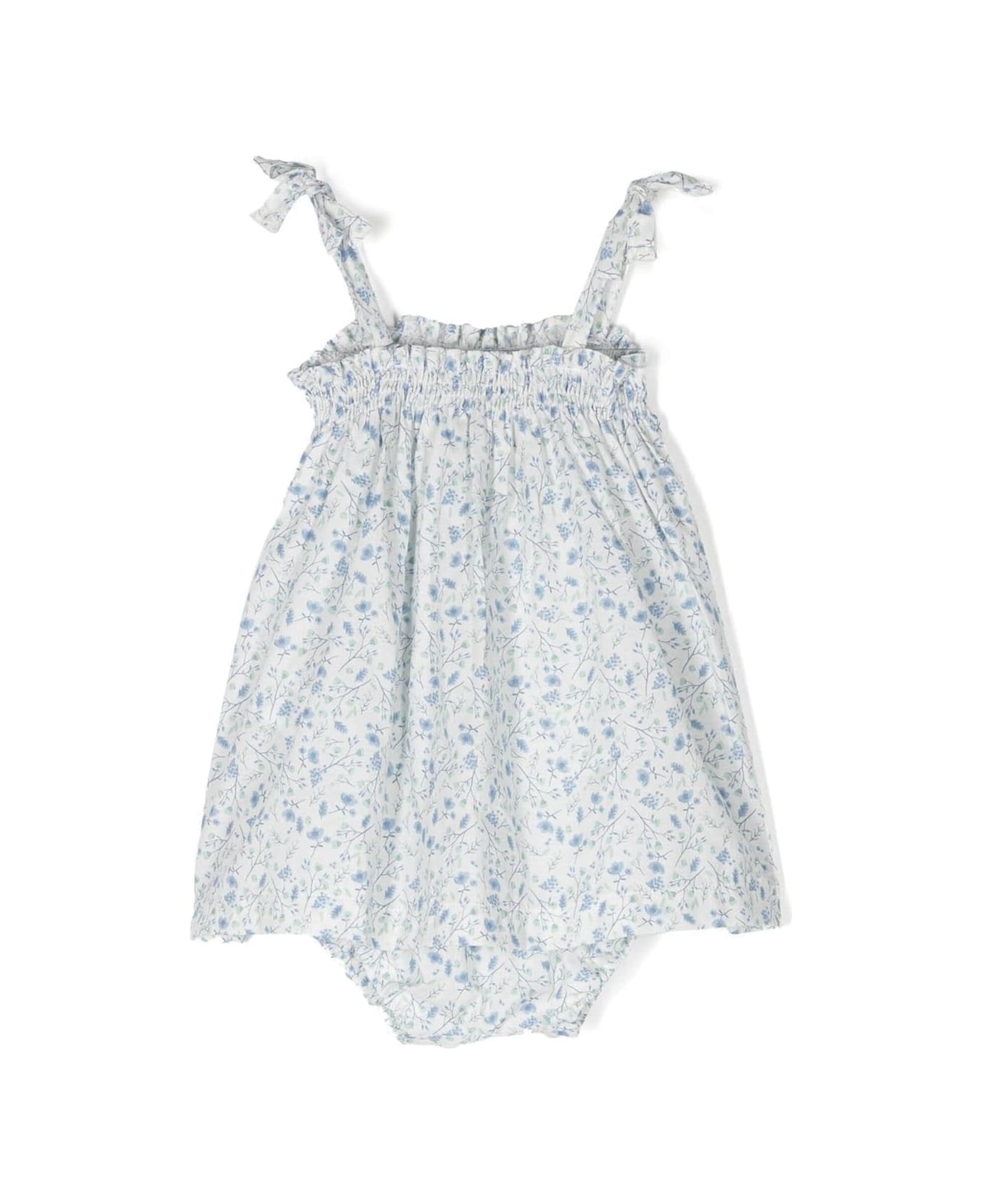 Teddy & Minou dress made of 100% white organic cotton with a floral pattern in shades of blue and green. The garment has a flared cut with a ruffled yoke and bow-tied braces and is combined with a culotte with practical elastic at the waist and bottom leg.