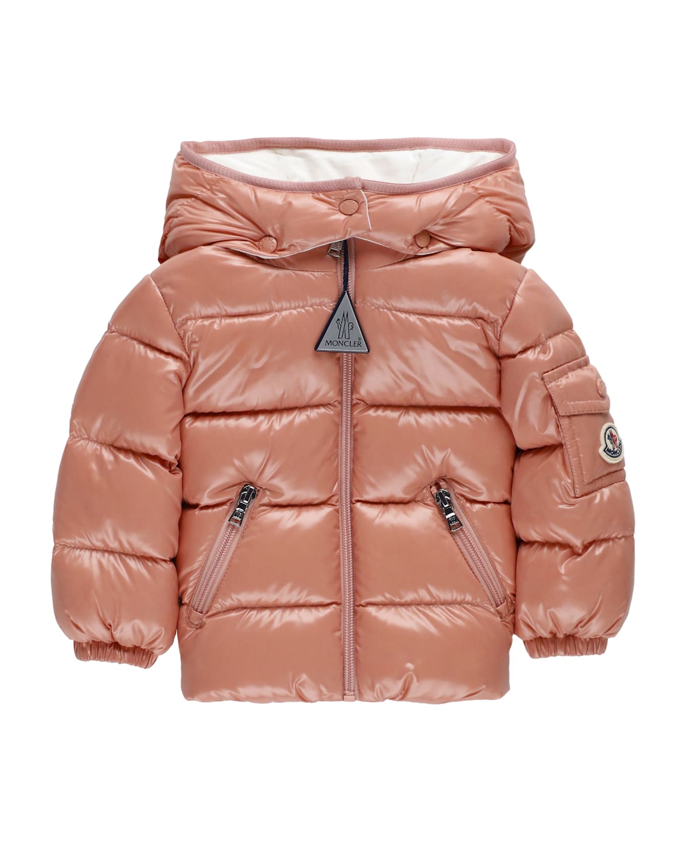 - Pink Moncler Baby quilted down jacket for girl - Hood - Long sleeves with elastic cuffs - Embroidered Moncler patch at left sleeve - Front zip fastening - Two front zip pockets