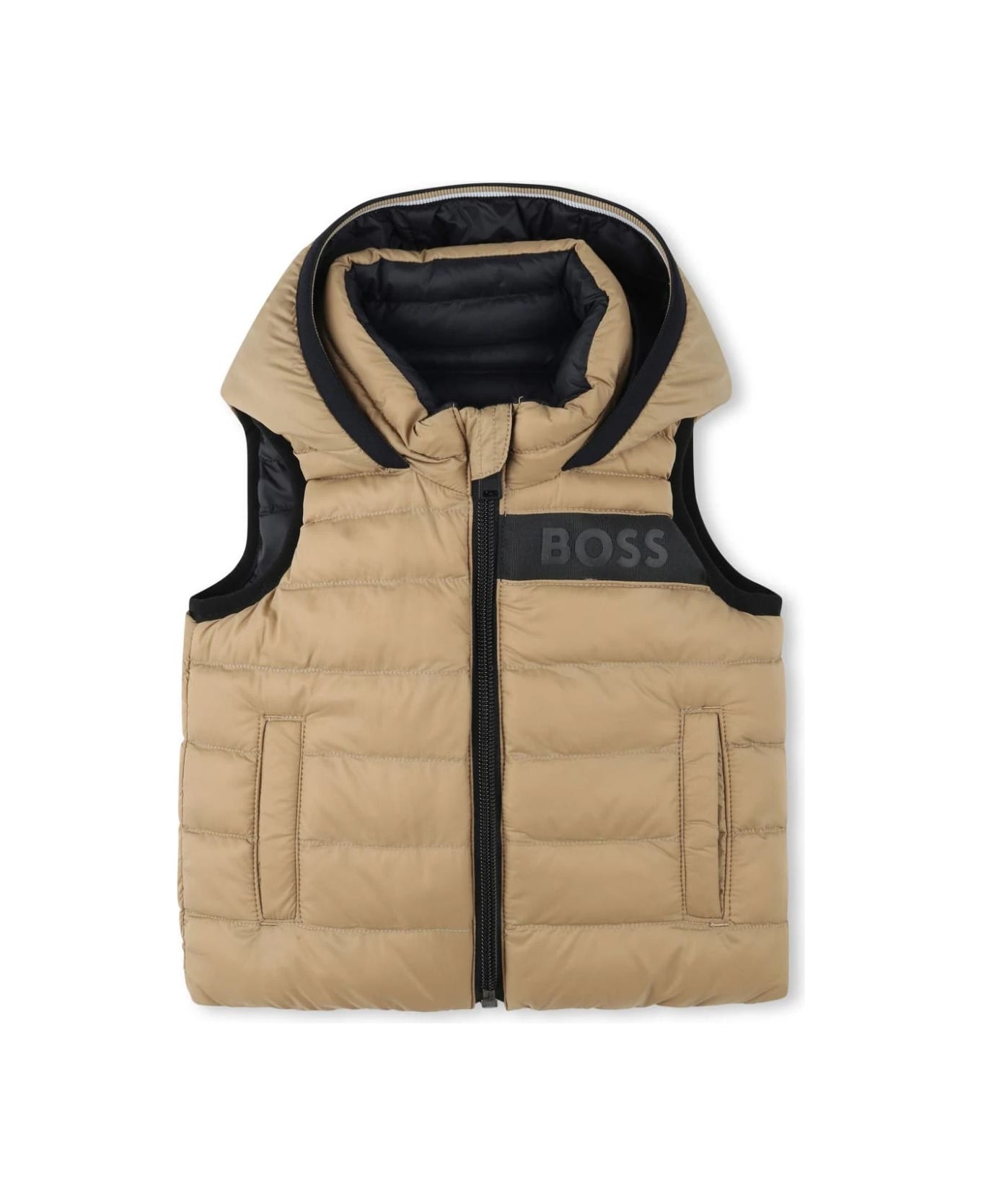 nero beige design reversibile chiusura frontale con zip cappuccio collo alto senza maniche stampa con logo sul petto due tasche a filetto laterali orlo dritto