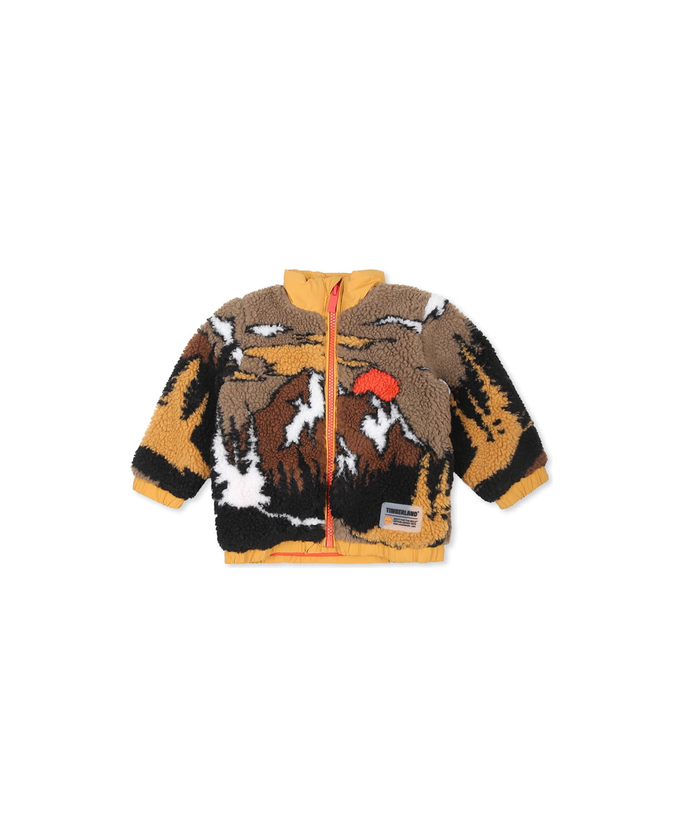 Green eco-friendly shearling faux fur coat, long sleeves, high collar, front zip fastening, side pockets, ribbed cuffs and hem. It is embellished with an all-over jacquard landscape and rubberized logo on the front.