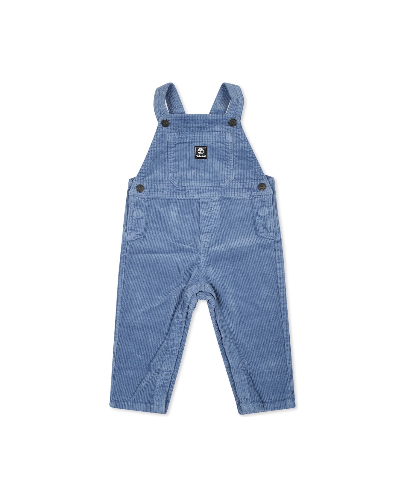 Light blue corduroy dungarees with suspenders with snap button closure and pocket on the front. It is embellished with logo patch on the front.
