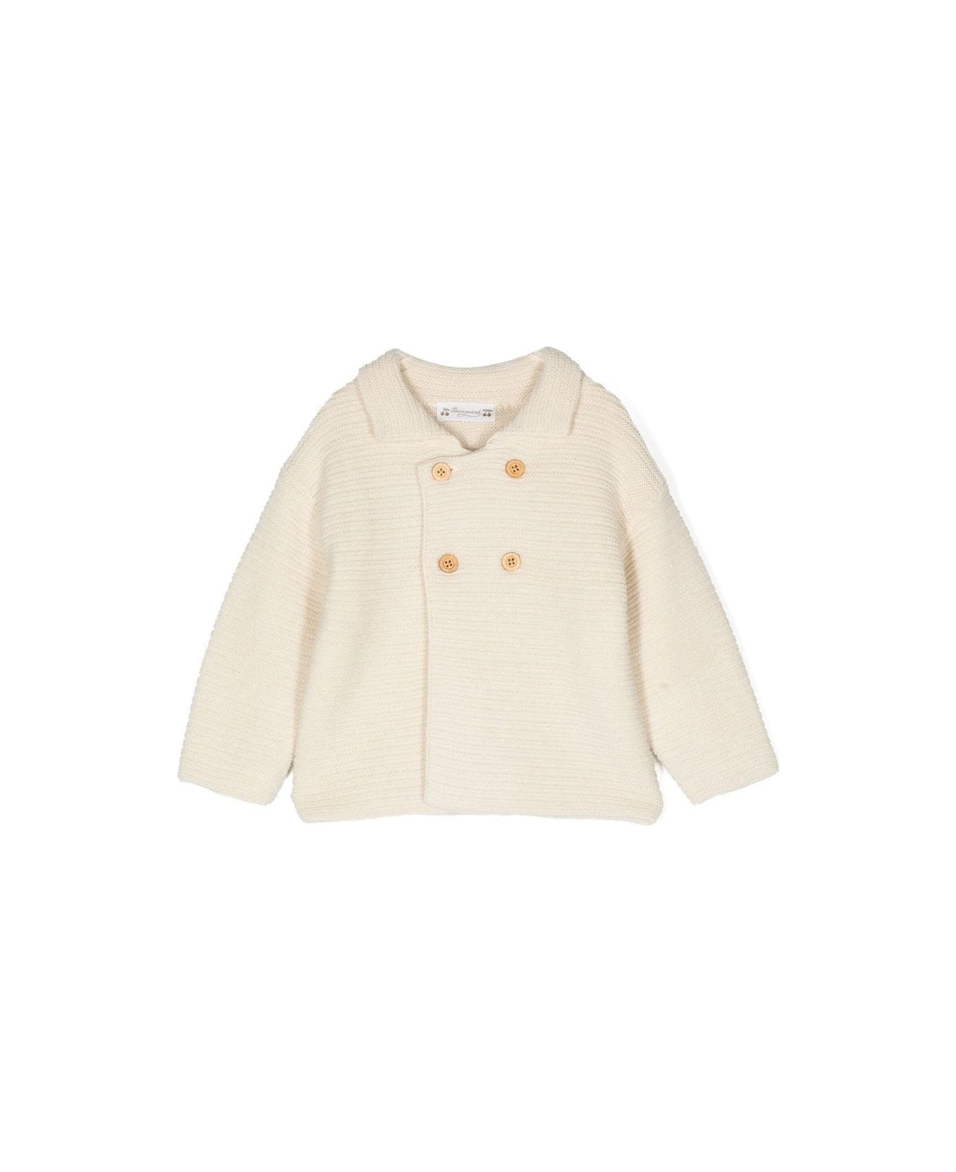 Milk-white Aalya jacket by Bonpoint made of wool and organic cotton and characterised by a double-breasted design, collar with lapels and wide armholes. The whimsical fabric, with alternating garter and stocking stitch, lends the garment a sailing spirit.