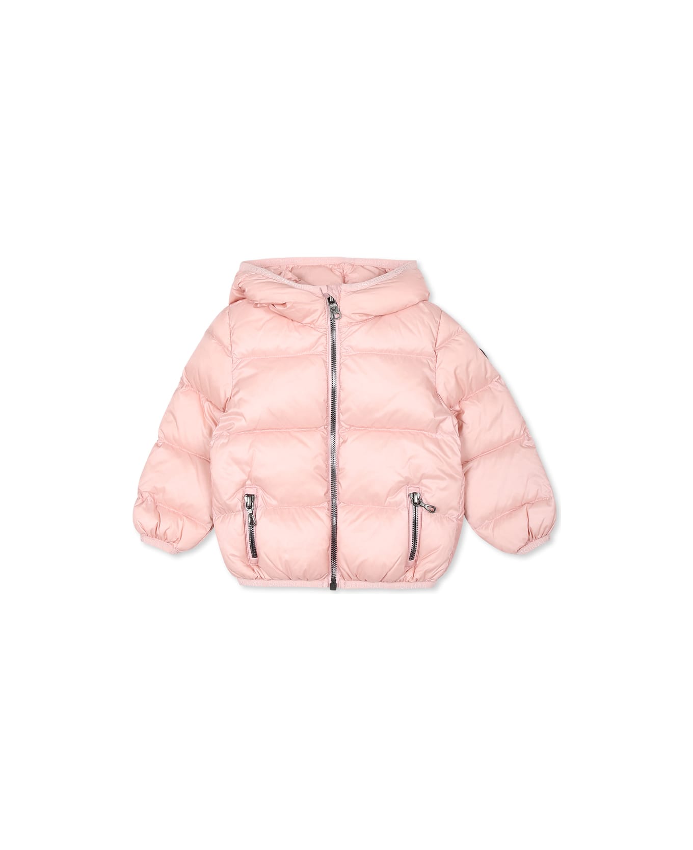 Lightly padded, quilted, pink down jacket with long sleeves, hood, front zip fastening, side zip pockets, elasticated cuffs and hem. It is embellished with a logo patch on the sleeve.