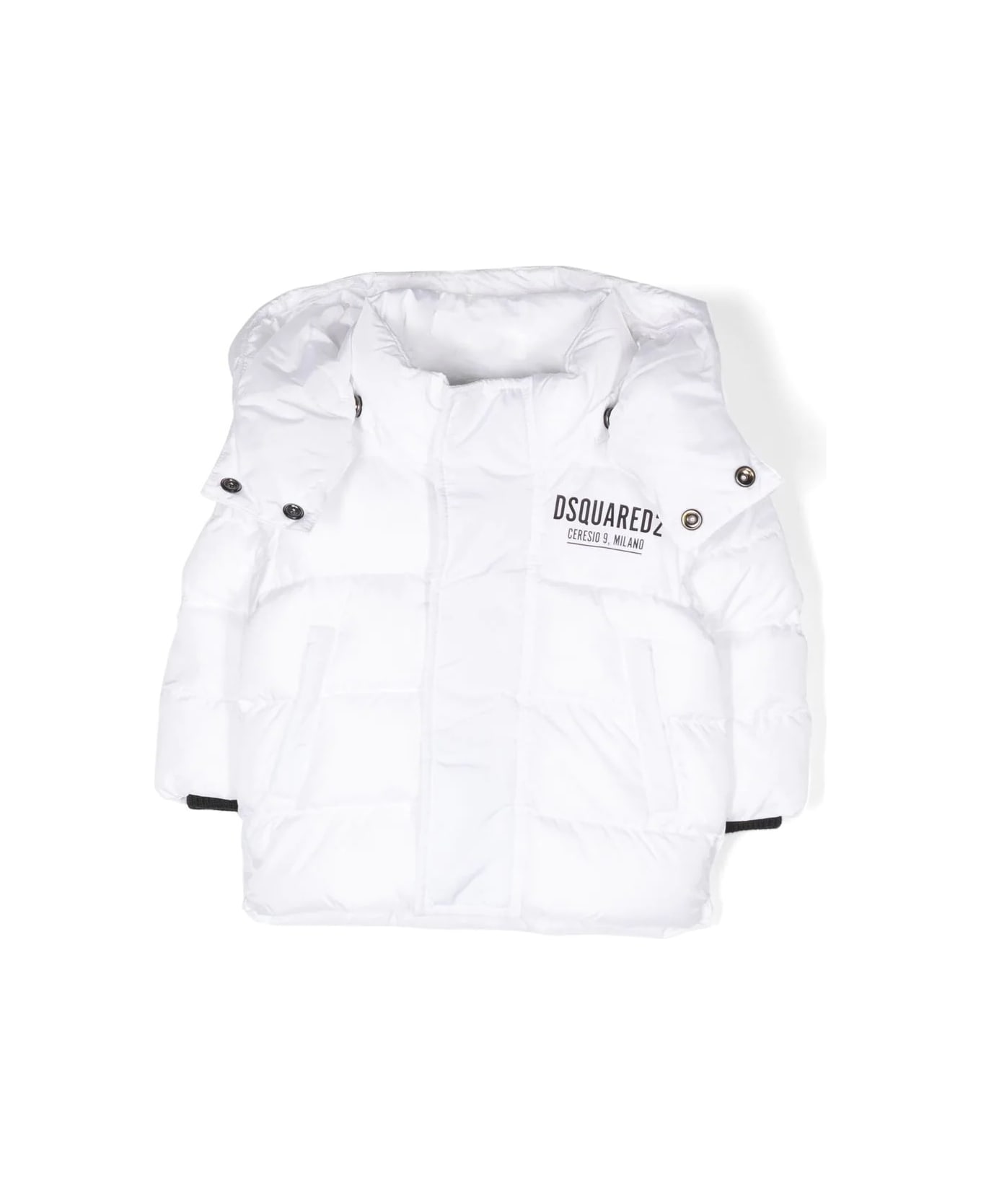 Dsquared2 Kids quilted white nylon puffer jacket featuring synthetic padding, a removable hood, a high collar, side pockets, a covered front fastening and a black "Dsquared2 CERESIO 9, Milano" print on the left chest.