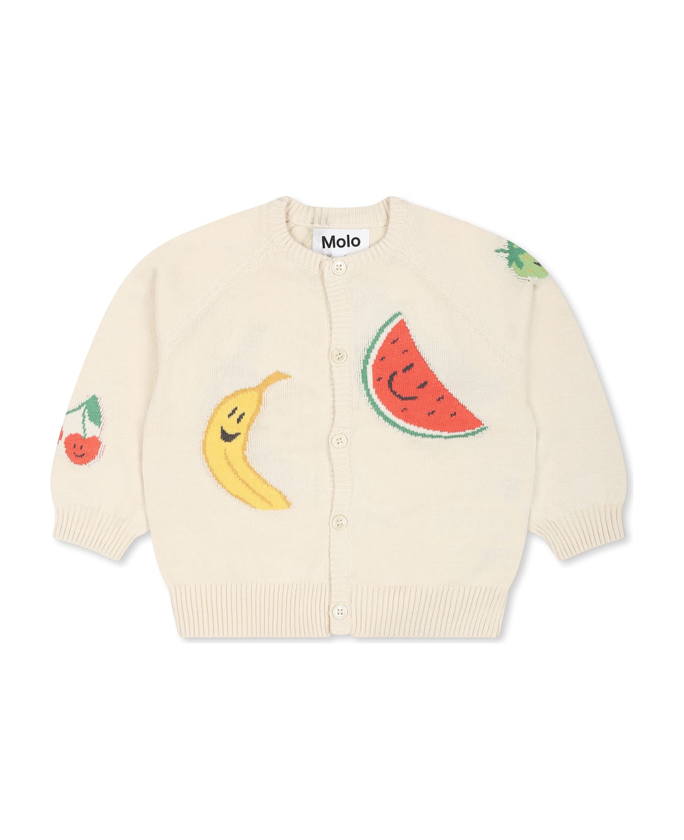 Ivory cardigan in GOTS certified organic cotton, with long sleeves, ribbed crew neck, cuffs and hem and front button fastening. It is embellished with jacquard fruit on the front and back.