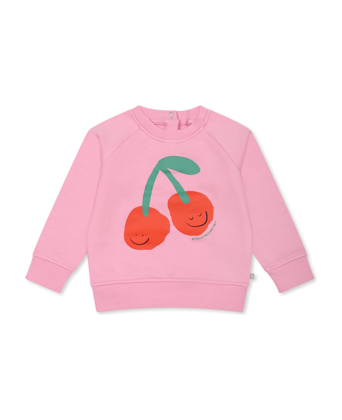 Pink sweatshirt in GOTS certified organic cotton, long sleeves, with crew neck, cuffs and hem in ribbed fabric and snap button fastening on the back. It is embellished with cherry print and logo on the front.