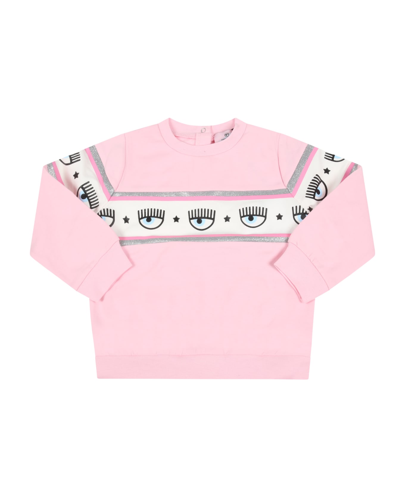 Pink sweatshirt in fleece cotton, with ribbed crew neck, hem and cuffs and button closure on the back. It is embellished with white stripe with iconic flirting eyes on the front and back.
