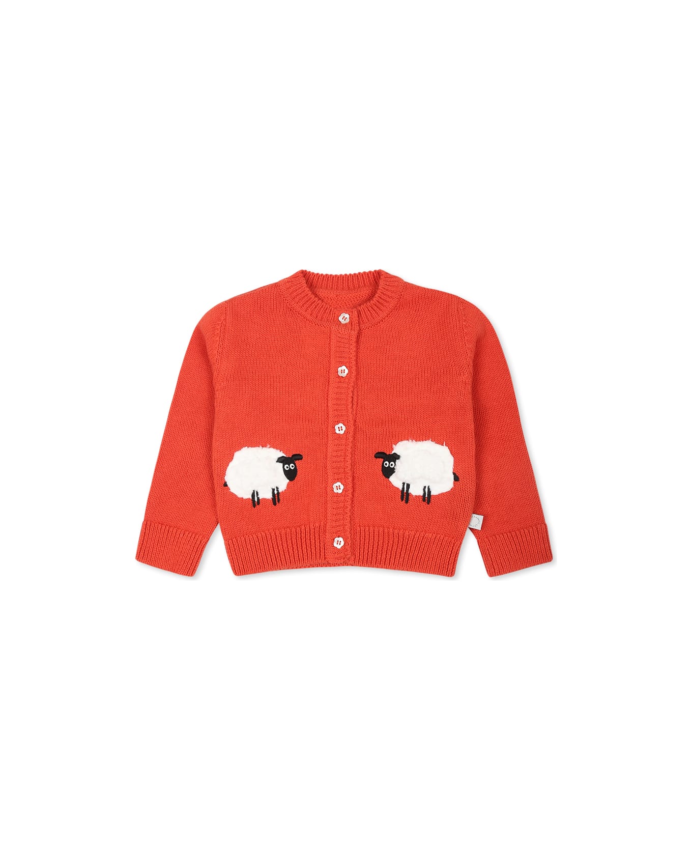 Red organic cotton and wool blend cardigan, long sleeves, ribbed crew neck, front button fastening, ribbed cuffs and hem. It is embellished with faux fur sheep embroidered on the front.