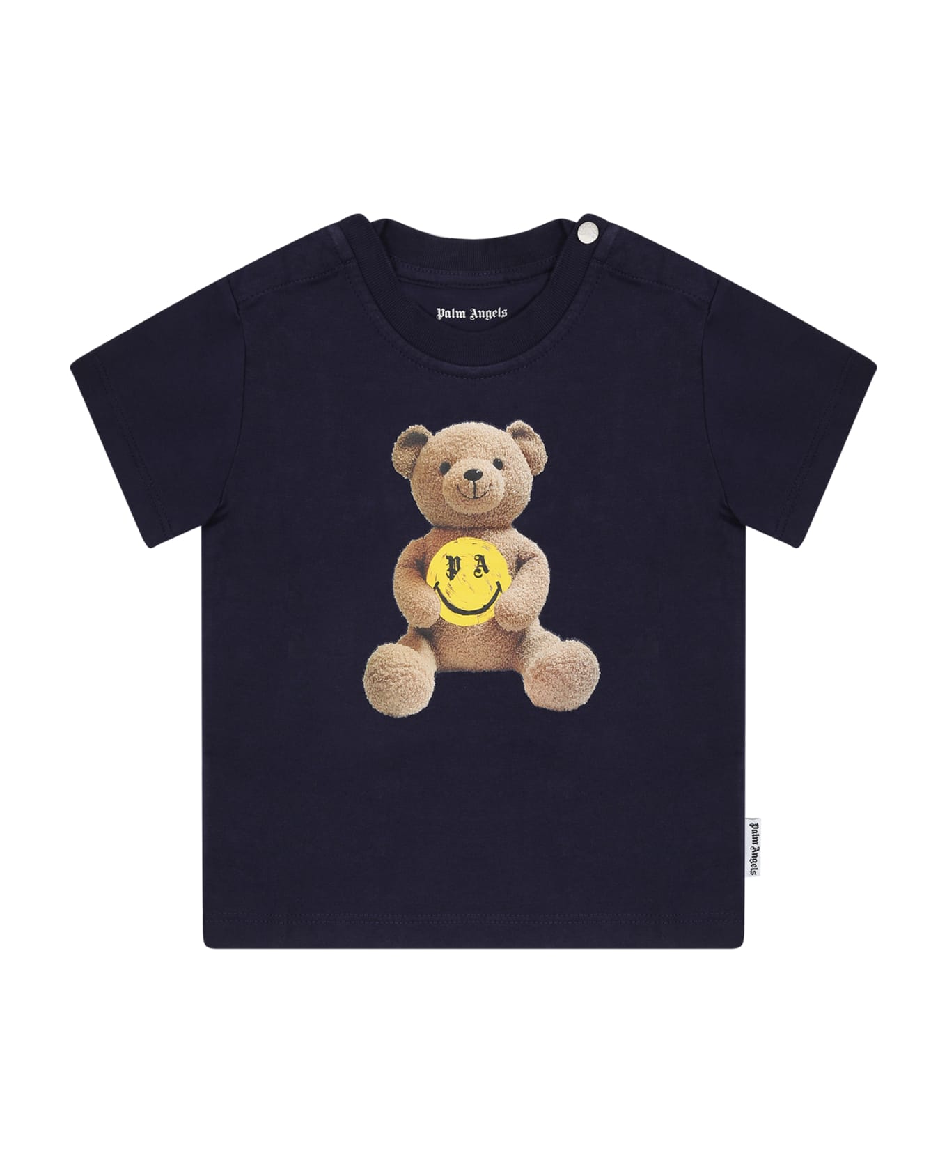 Blue cotton t-shirt with short sleeves, ribbed crew neck and snap button closure on the shoulder. It is embellished with bear and smiley, on the front. It's a Smiley collaboration for Palm angels.