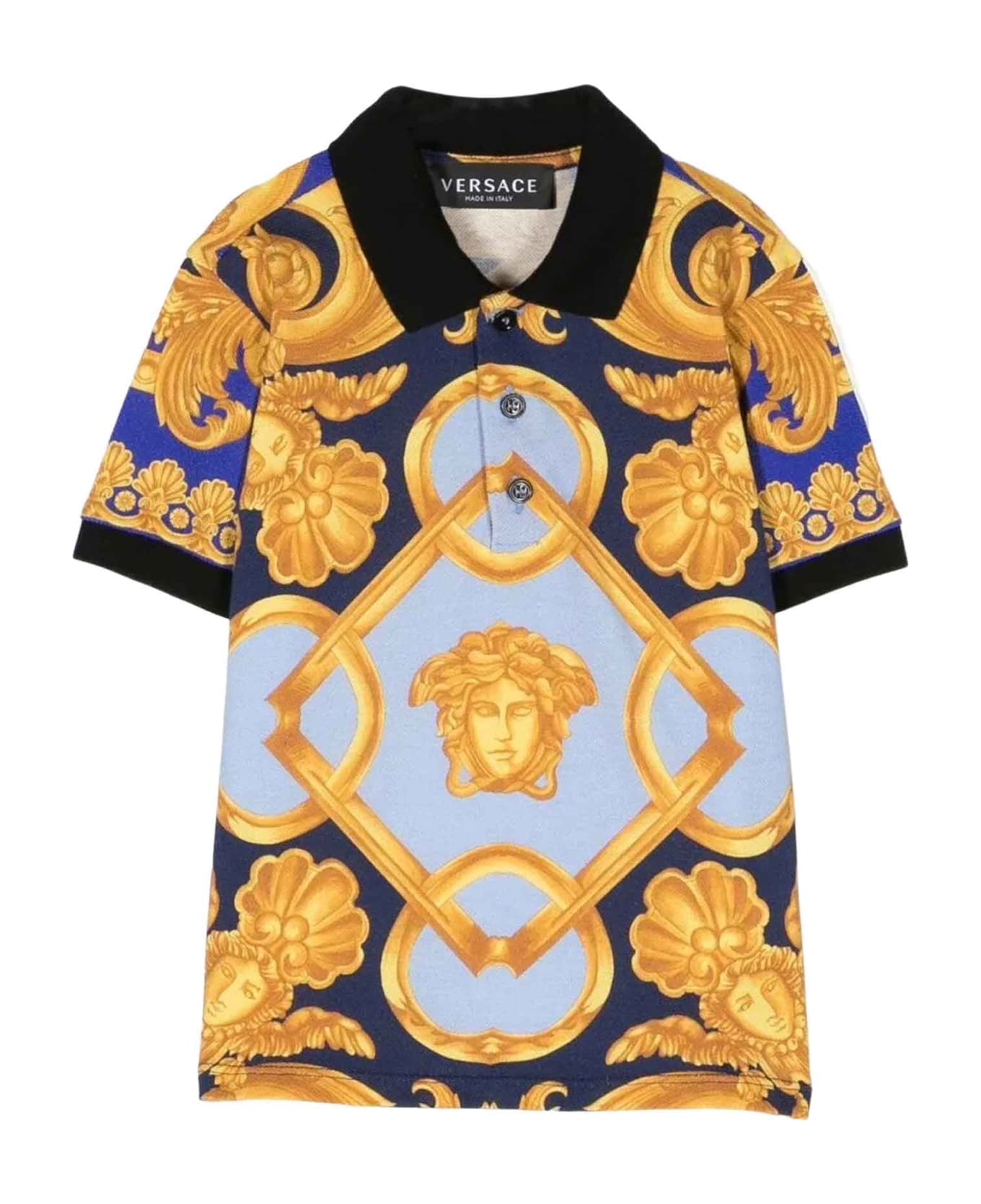 blue/gold polo shirt unisex kids. Medusa head motif, baroque print, contrast collar, classic collar, short front button placket, short sleeves and straight hem. 100% Cotton